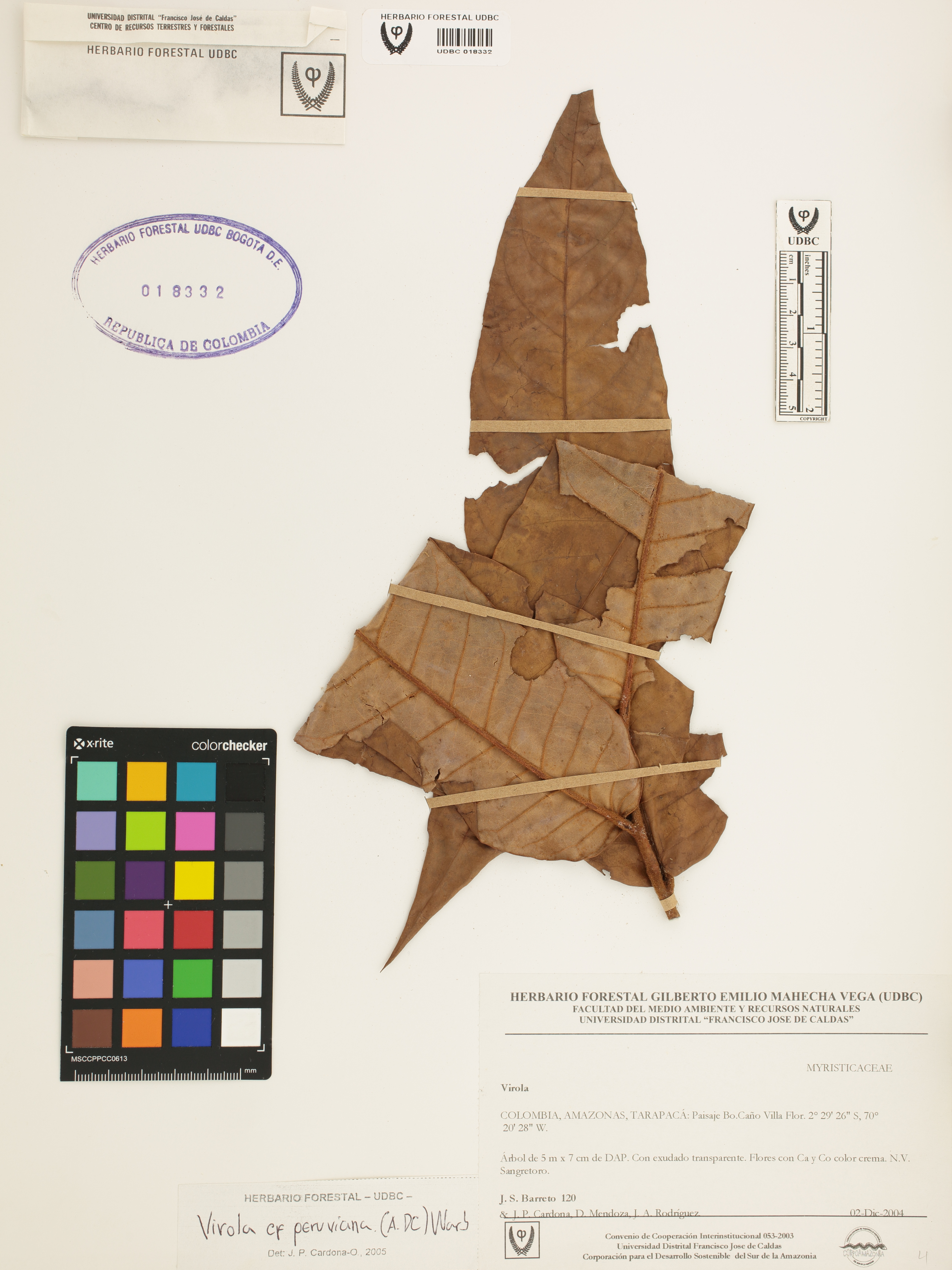 Fotografía del ejemplar Barreto, J. 120, determinado como Virola peruviana en el año 2005