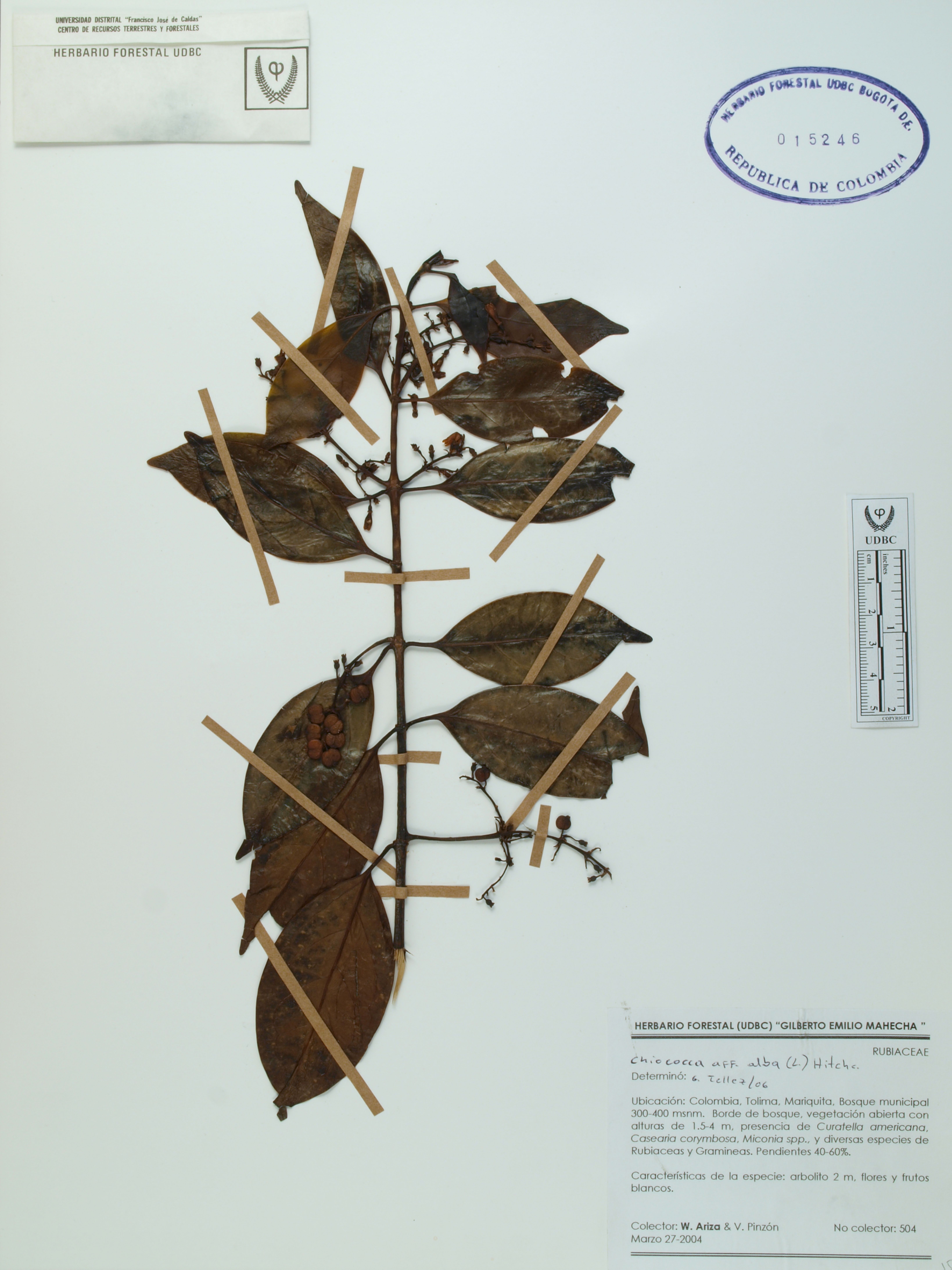 Fotografía del ejemplar Ariza, W. 504, determinado como Chiococca alba en el año 2006