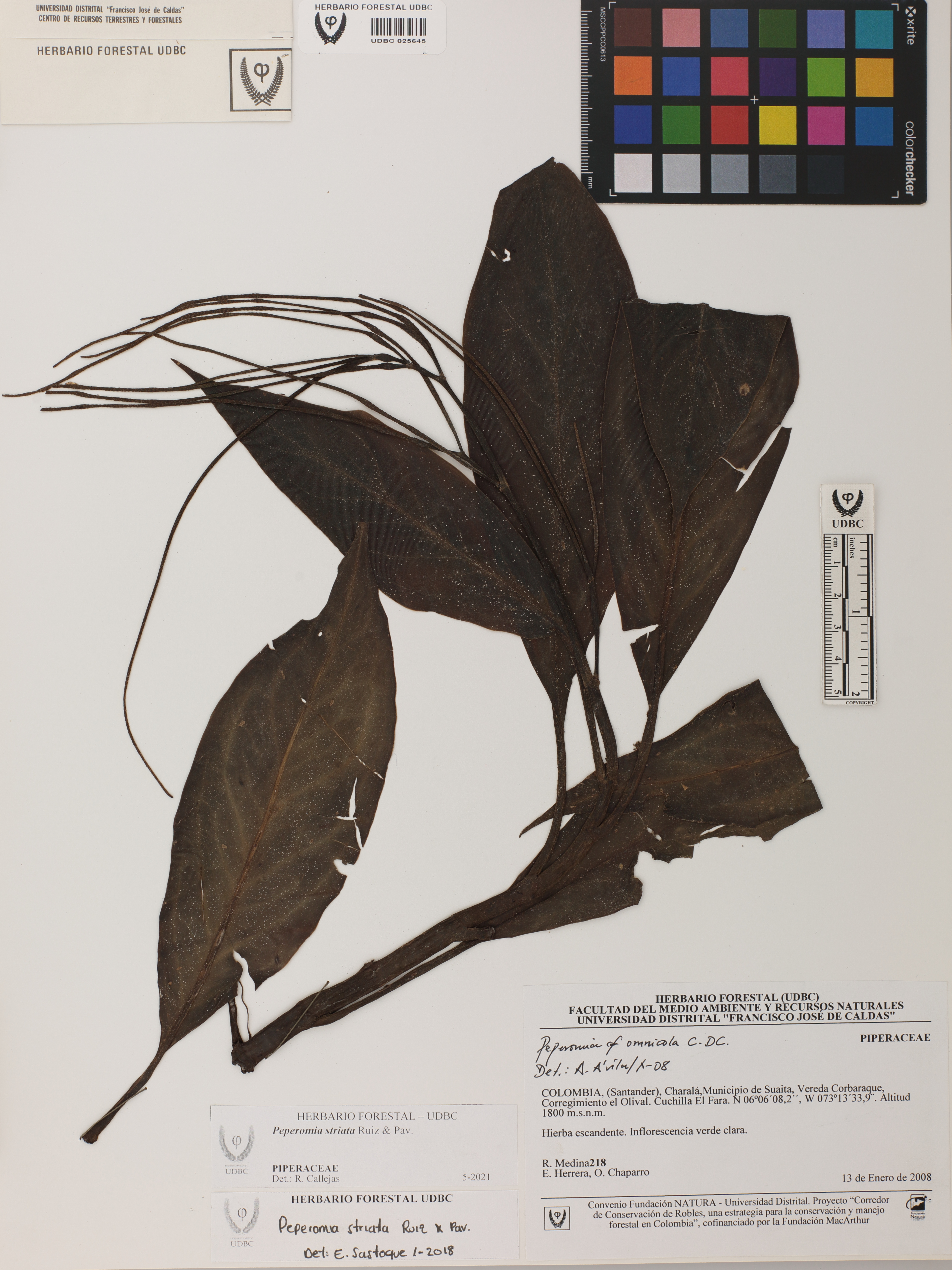 Fotografía del ejemplar Medina, R. 218, determinado como Peperomia striata en el año 2021