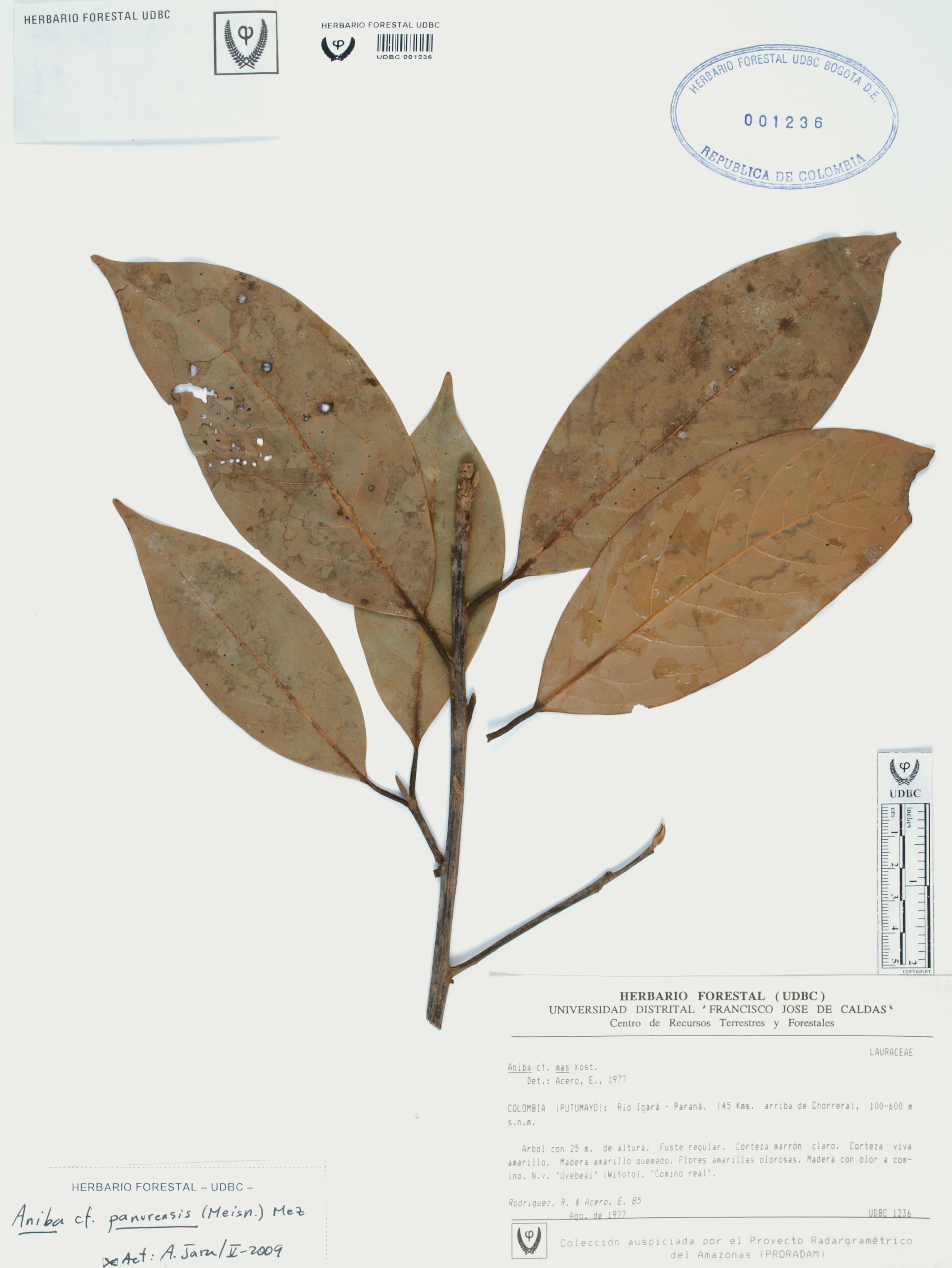 Fotografía del ejemplar Rodríguez, R. 85, determinado como Aniba panurensis en el año 2009