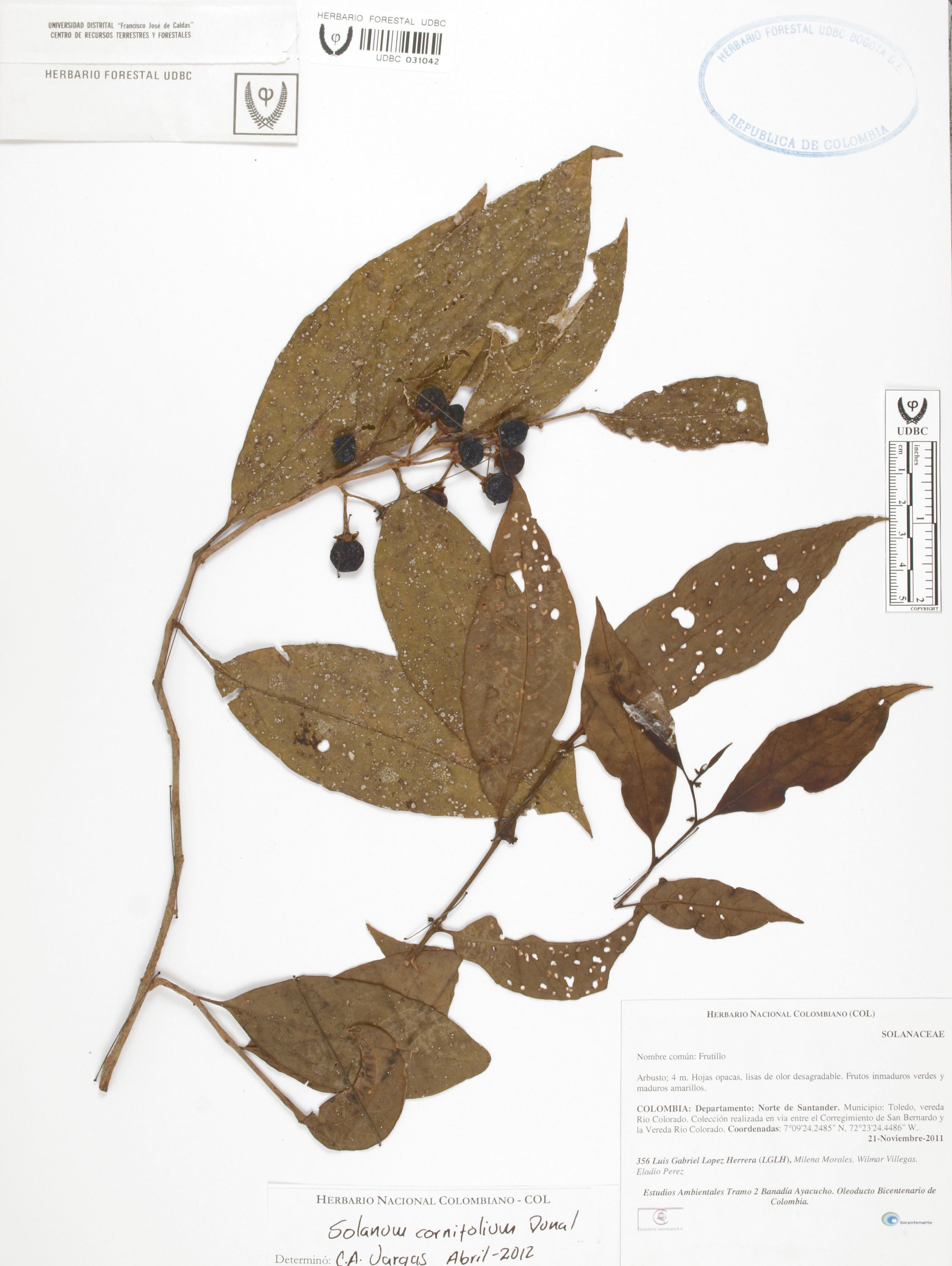 Fotografía del ejemplar López, L. 356, determinado como Solanum cornifolium en el año 2012
