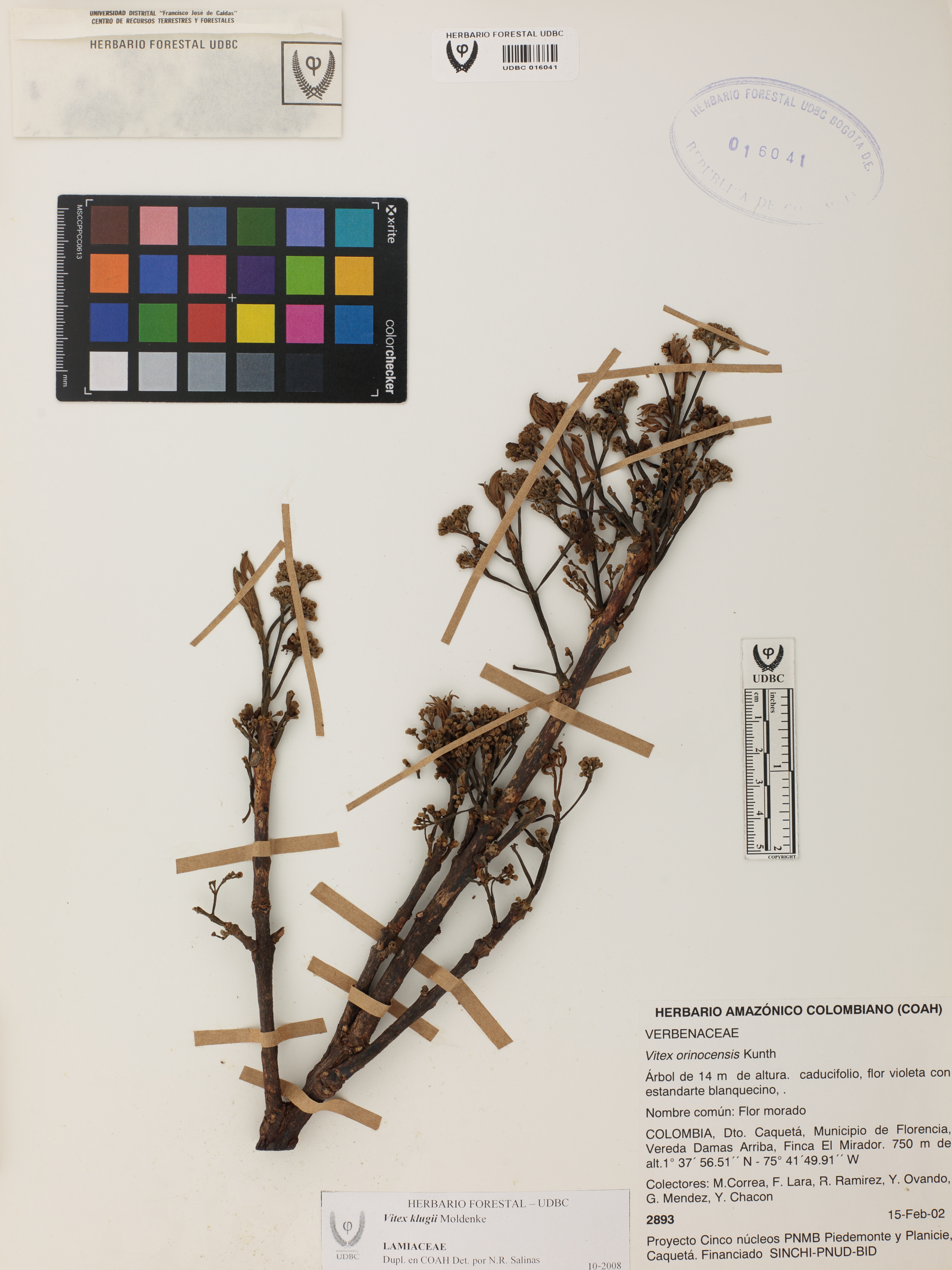 Fotografía del ejemplar Correa, M. 2893, determinado como Vitex klugii en el año 2008