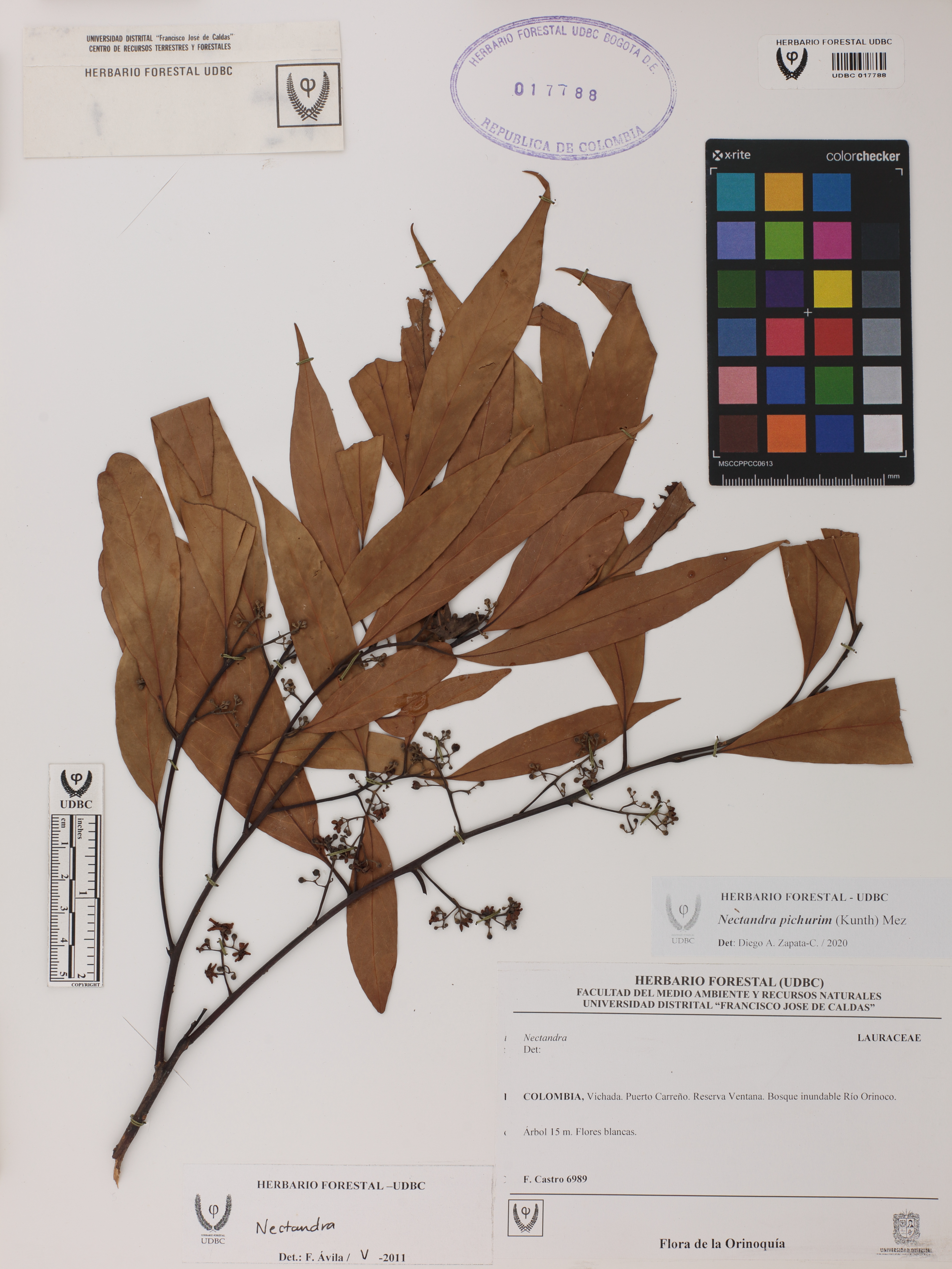 Fotografía del ejemplar Castro, F. 6989, determinado como Nectandra pichurim en el año 2020