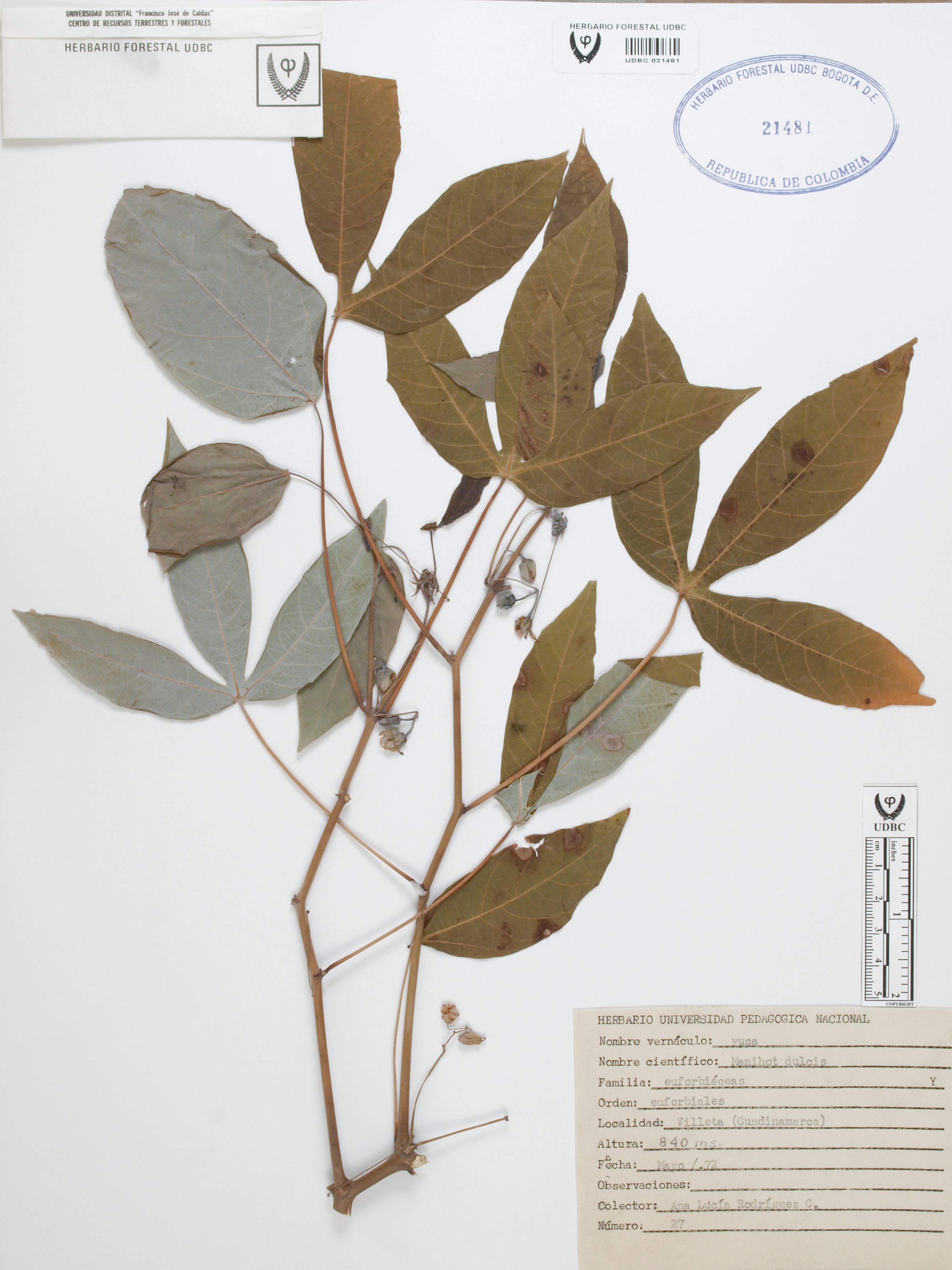 Fotografía del ejemplar Rodríguez, A. 27, determinado como Manihot dulcis