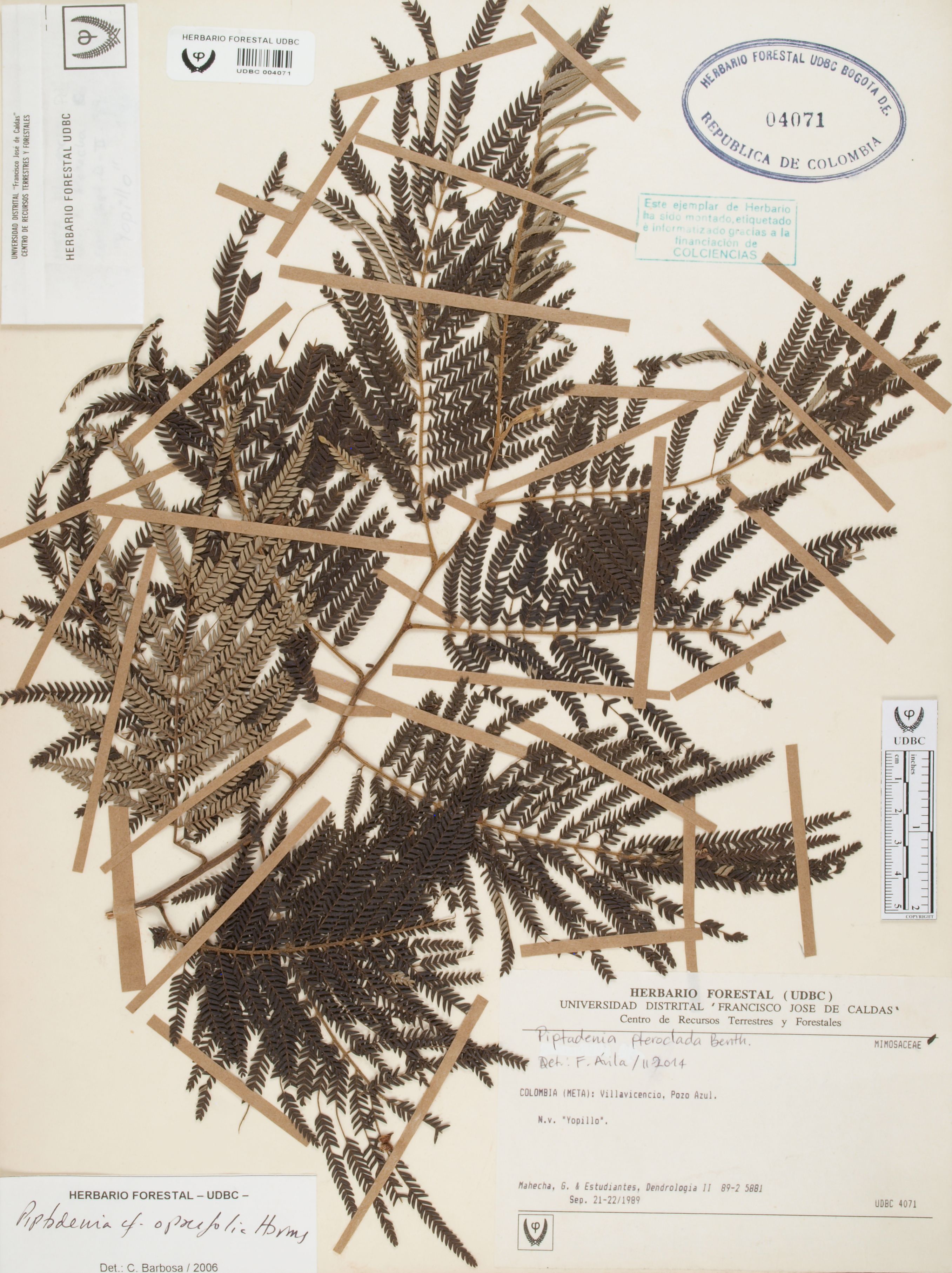 Fotografía del ejemplar Mahecha, G. 5881, determinado como Piptadenia pteroclada en el año 2014