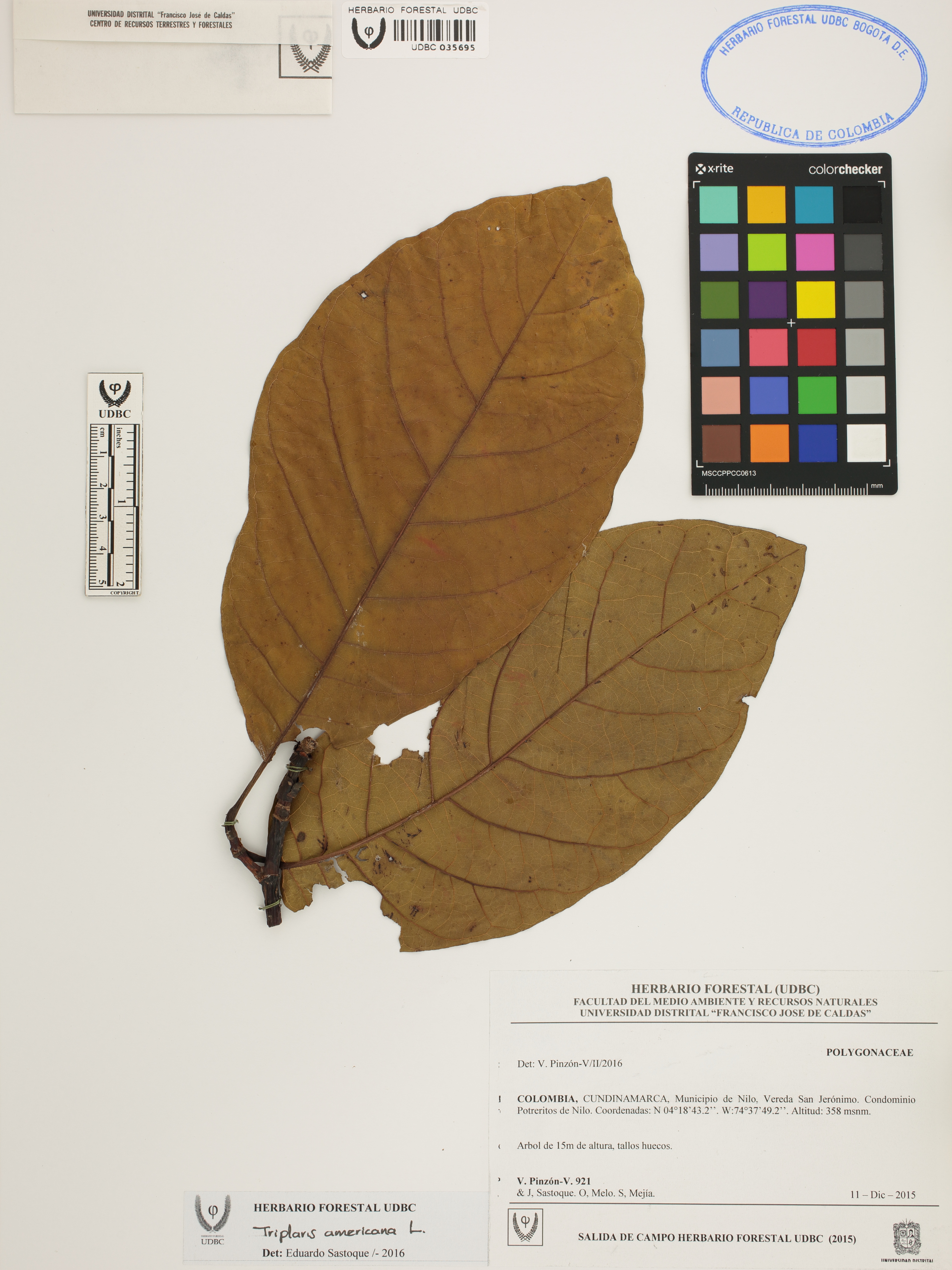 Fotografía del ejemplar Pinzón-V., V. 921, determinado como Triplaris americana en el año 2016