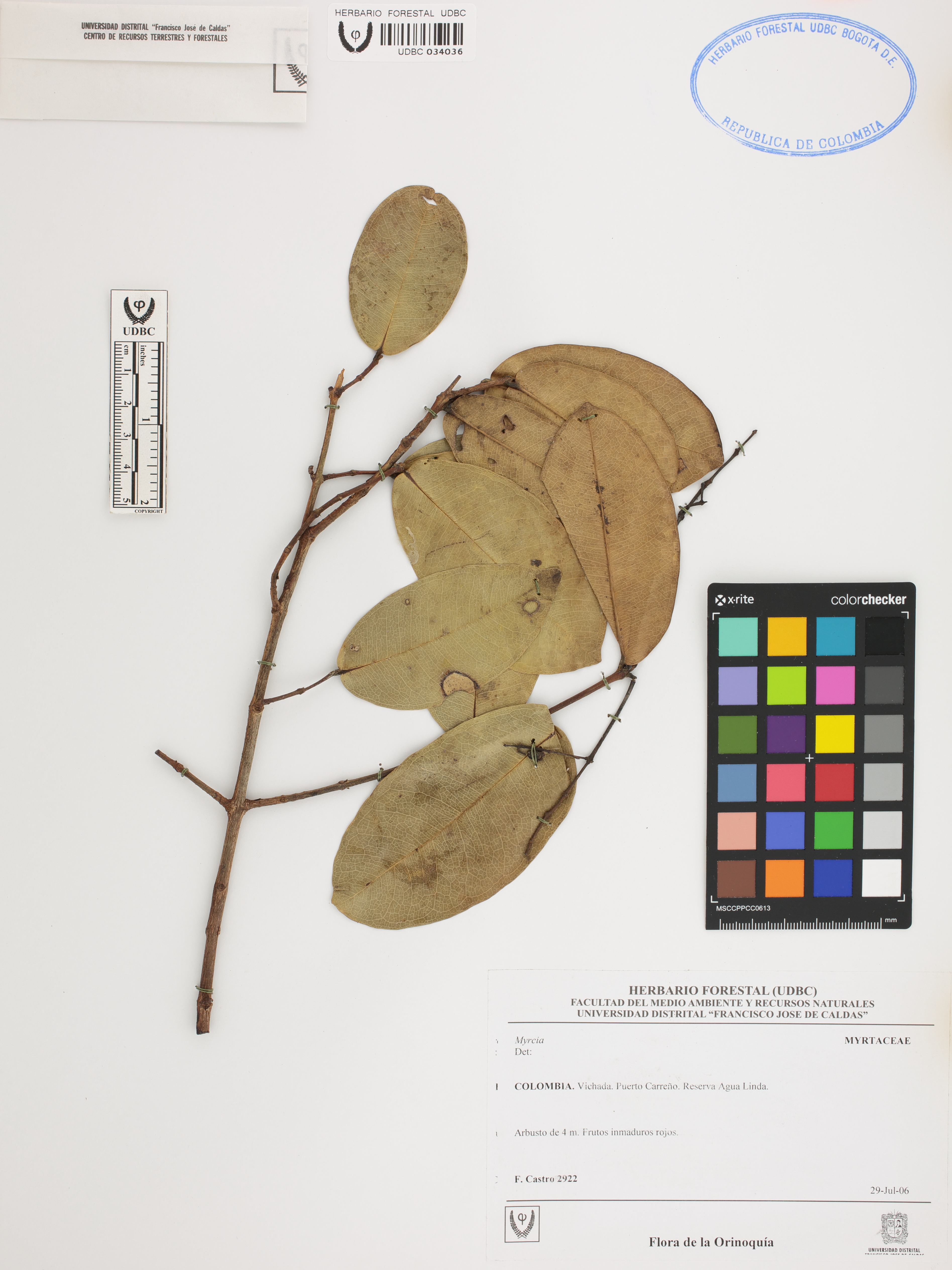 Fotografía del ejemplar Castro, F. 2922, determinado como Myrcia sp.