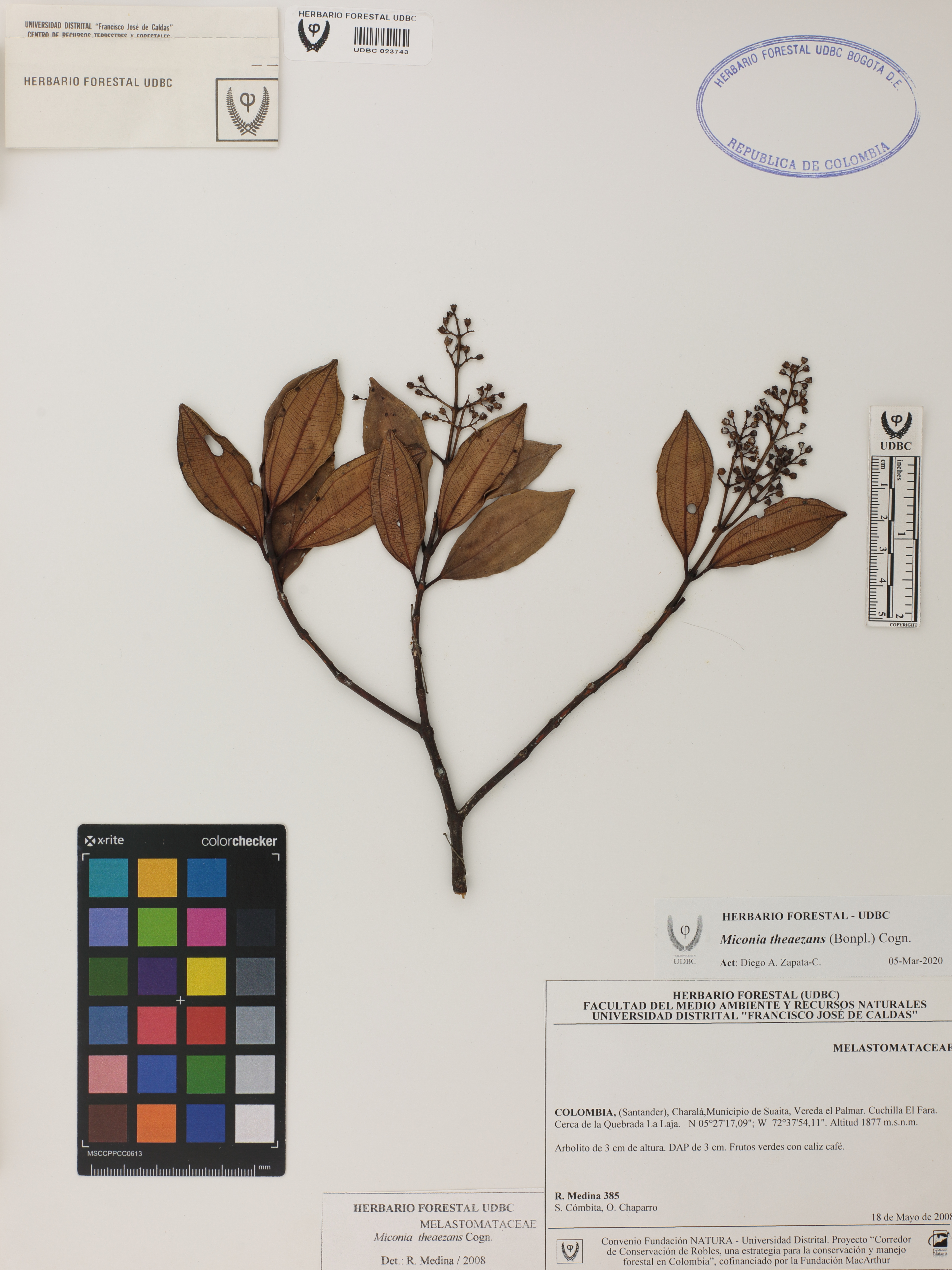 Fotografía del ejemplar Medina, R. 385, determinado como Miconia theaezans en el año 2008