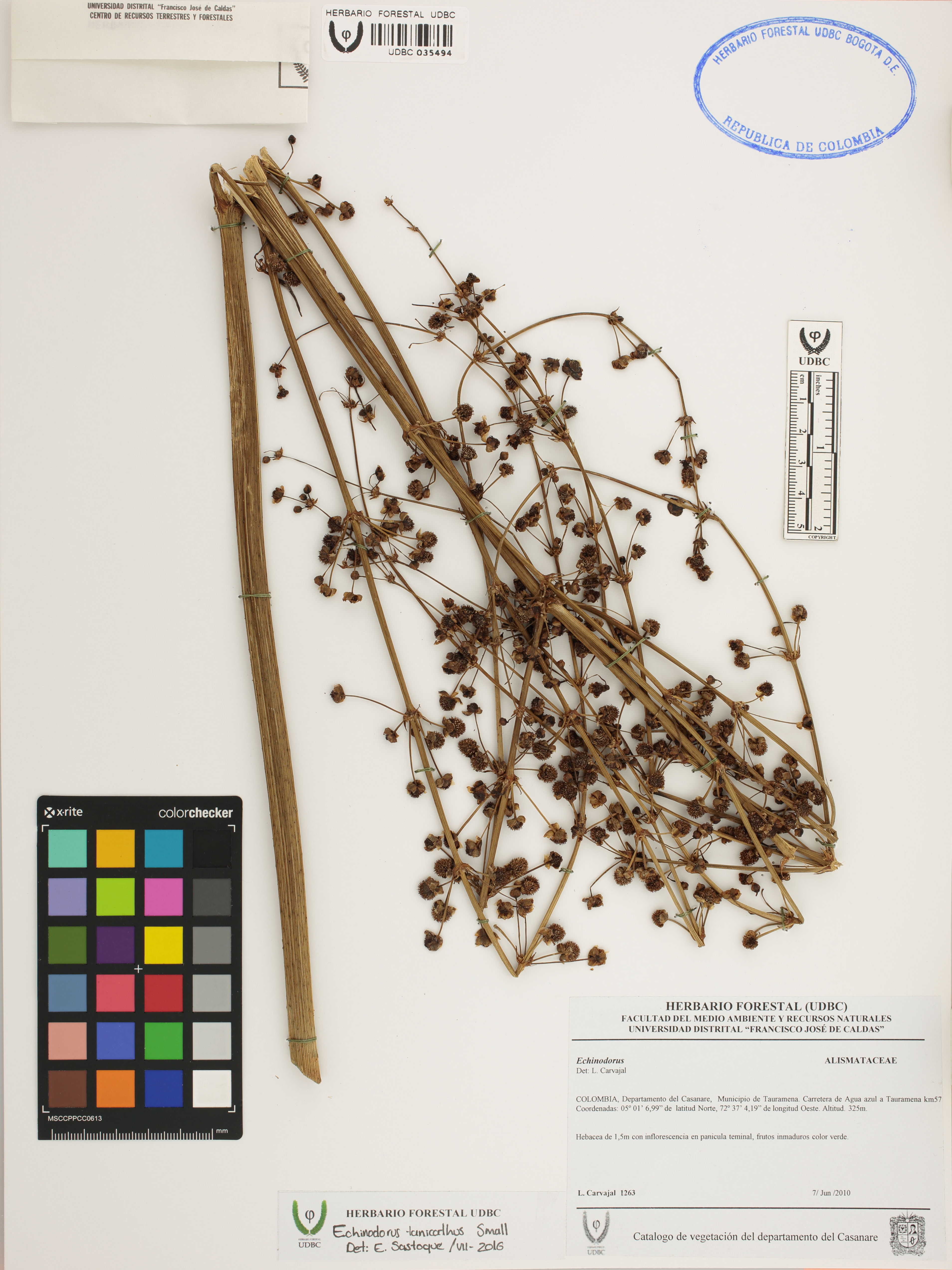 Fotografía del ejemplar Carvajal, L. 1263, determinado como Echinodorus tunicatus en el año 2016