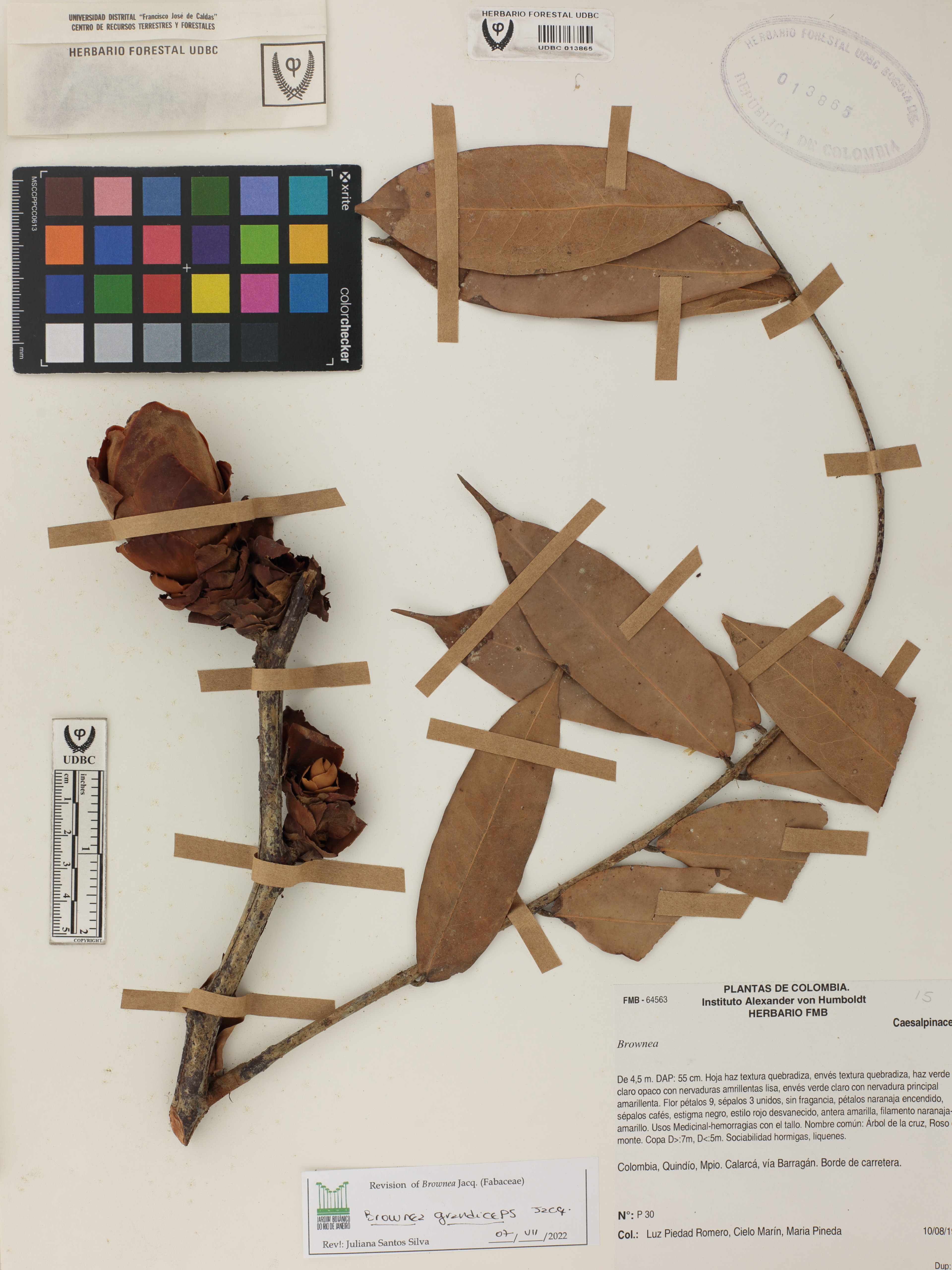 | dc.description | Fotografía del ejemplar Romero, P. 30, determinado como Brownea grandiceps en el año 2022 | |