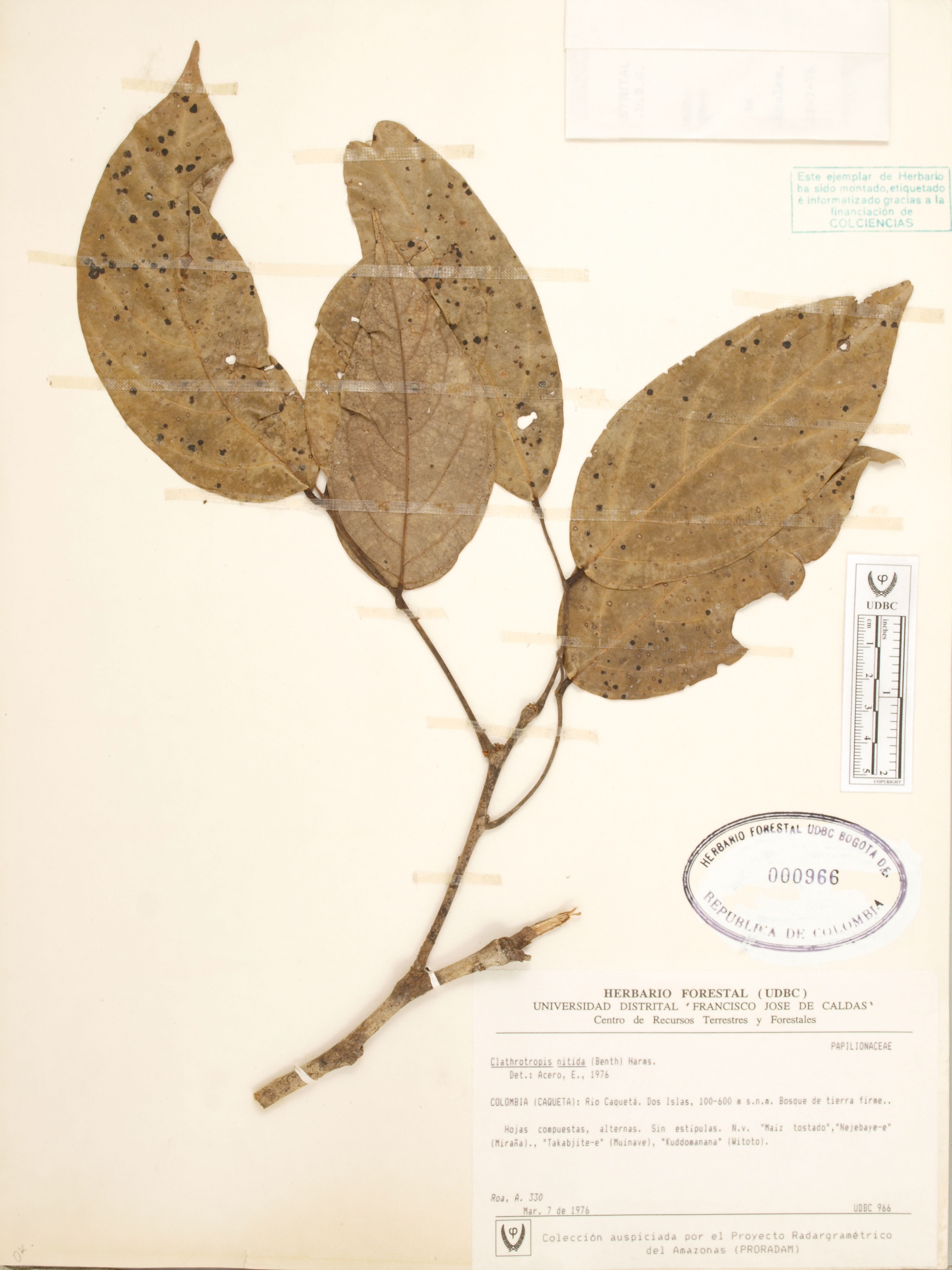 Fotografía del ejemplar Roa, A. 330, determinado como Clathrotropis nitida en el año 1976