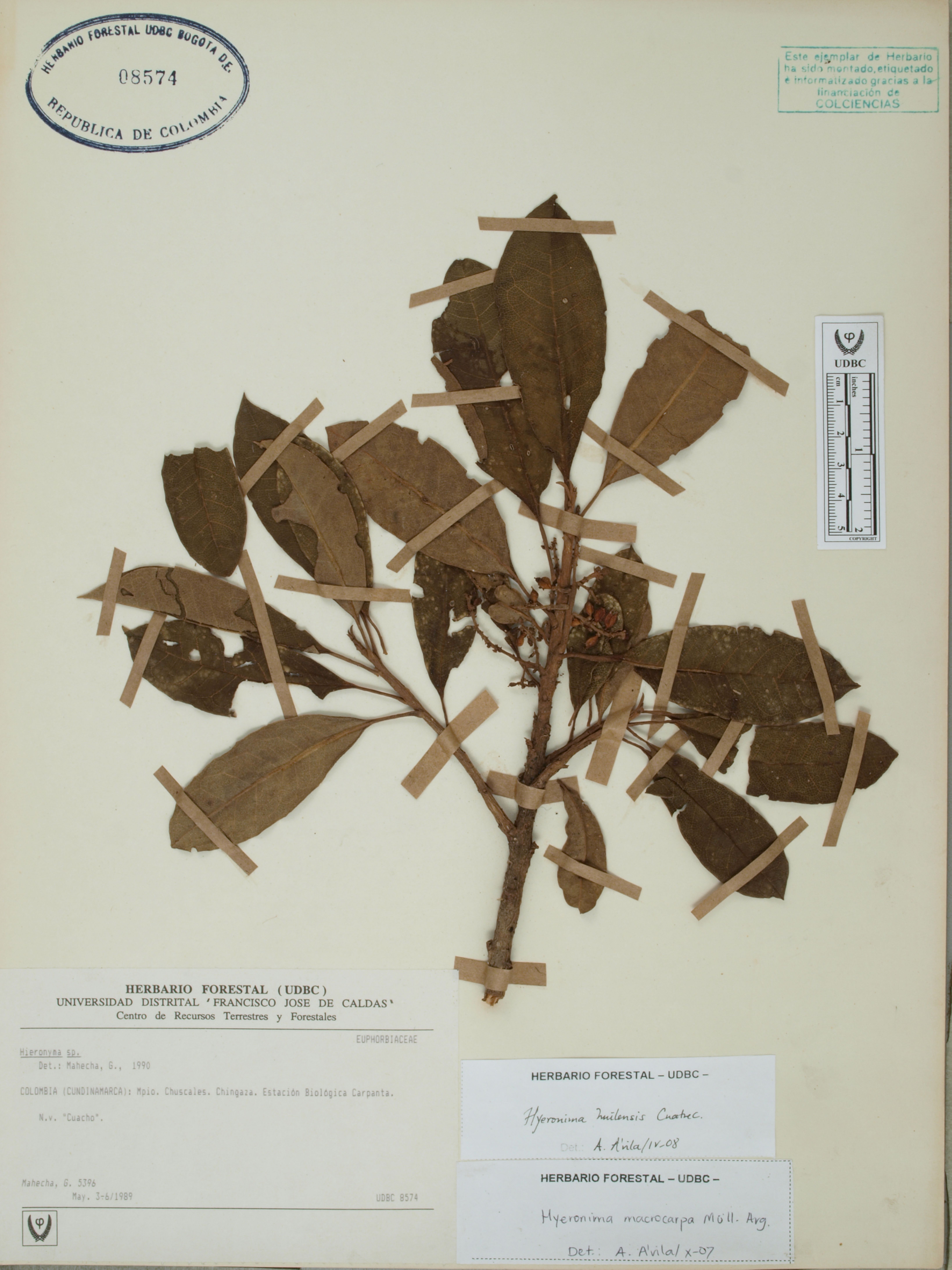 Fotografía del ejemplar Mahecha, G. 5396, determinado como Hieronyma huilensis en el año 2008