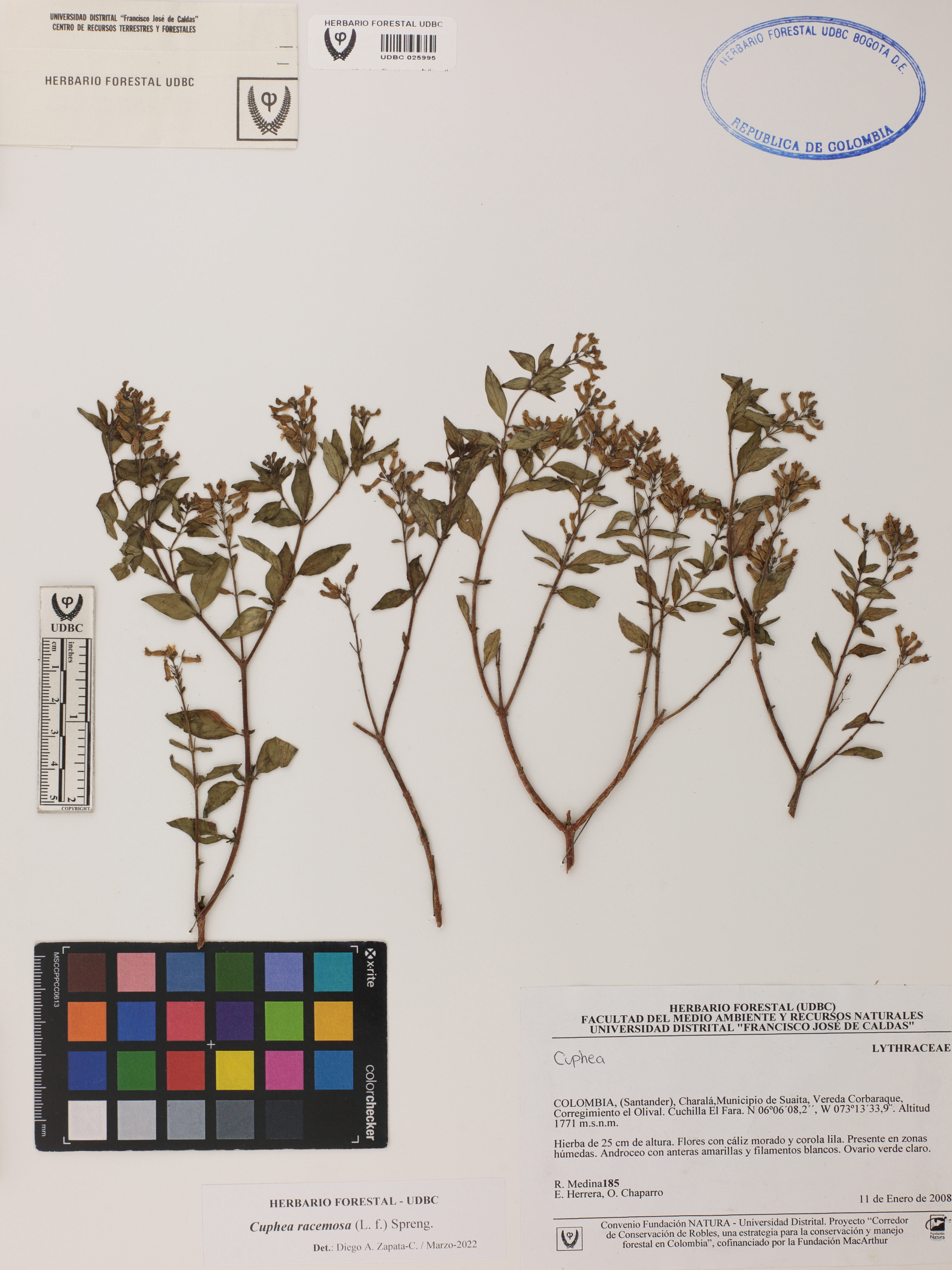 Fotografía del ejemplar Medina, R. 185, determinado como Cuphea racemosa en el año 2022