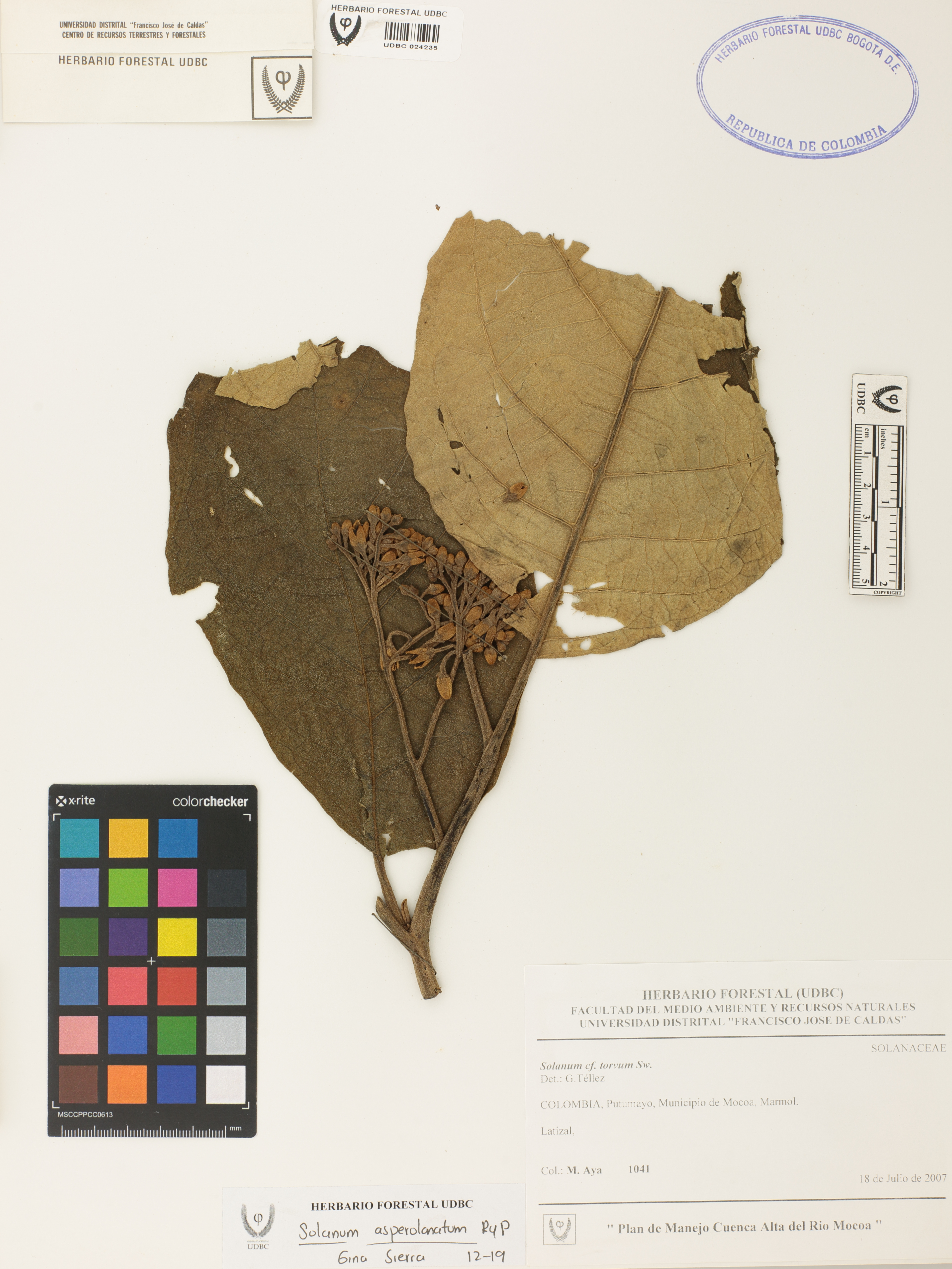 Fotografía del ejemplar Aya, M. 1041, determinado como Solanum asperolanatum en el año 2019