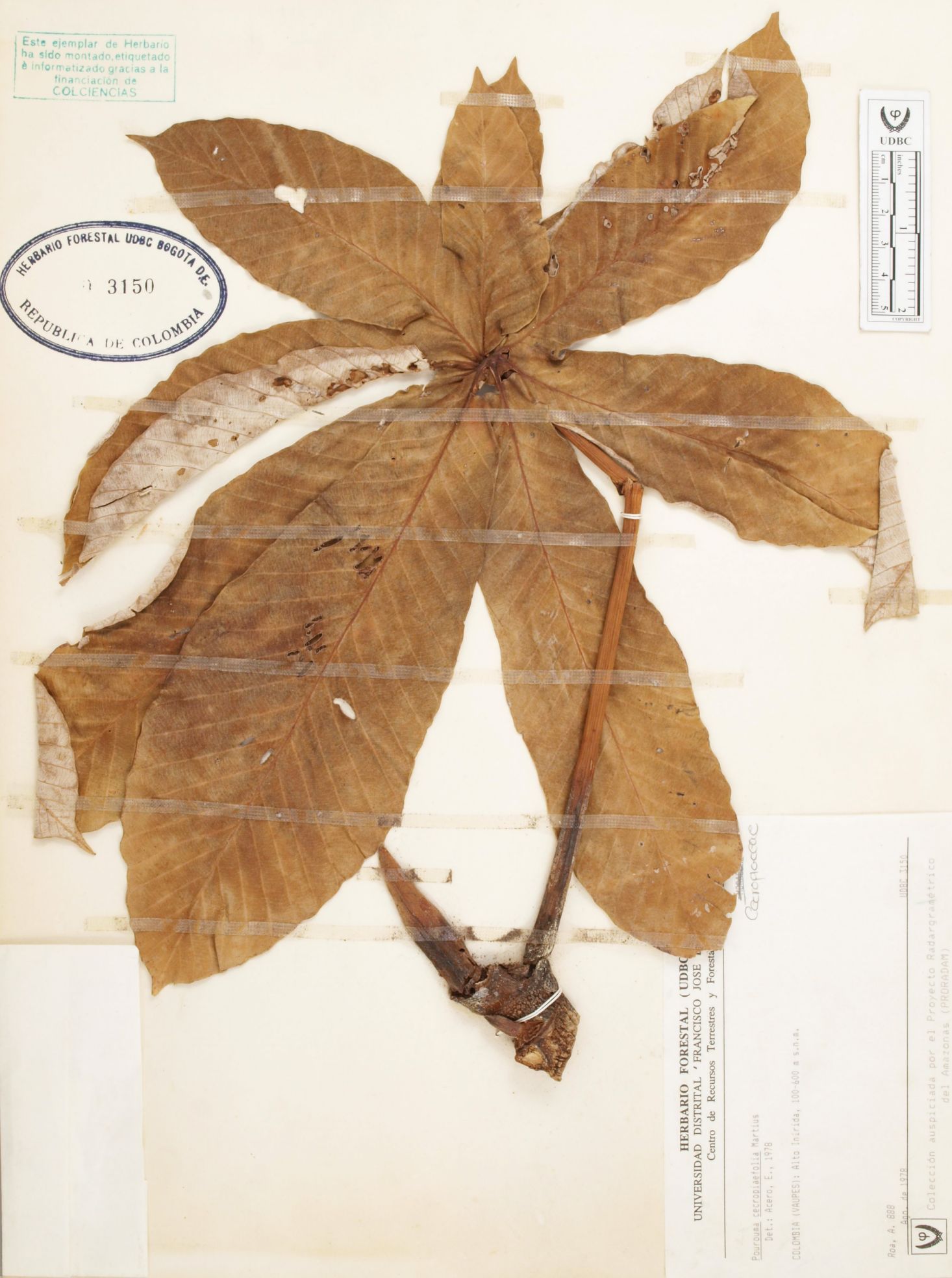 Fotografía del ejemplar Roa, A. 888, determinado como Pourouma cecropiifolia en el año 1978