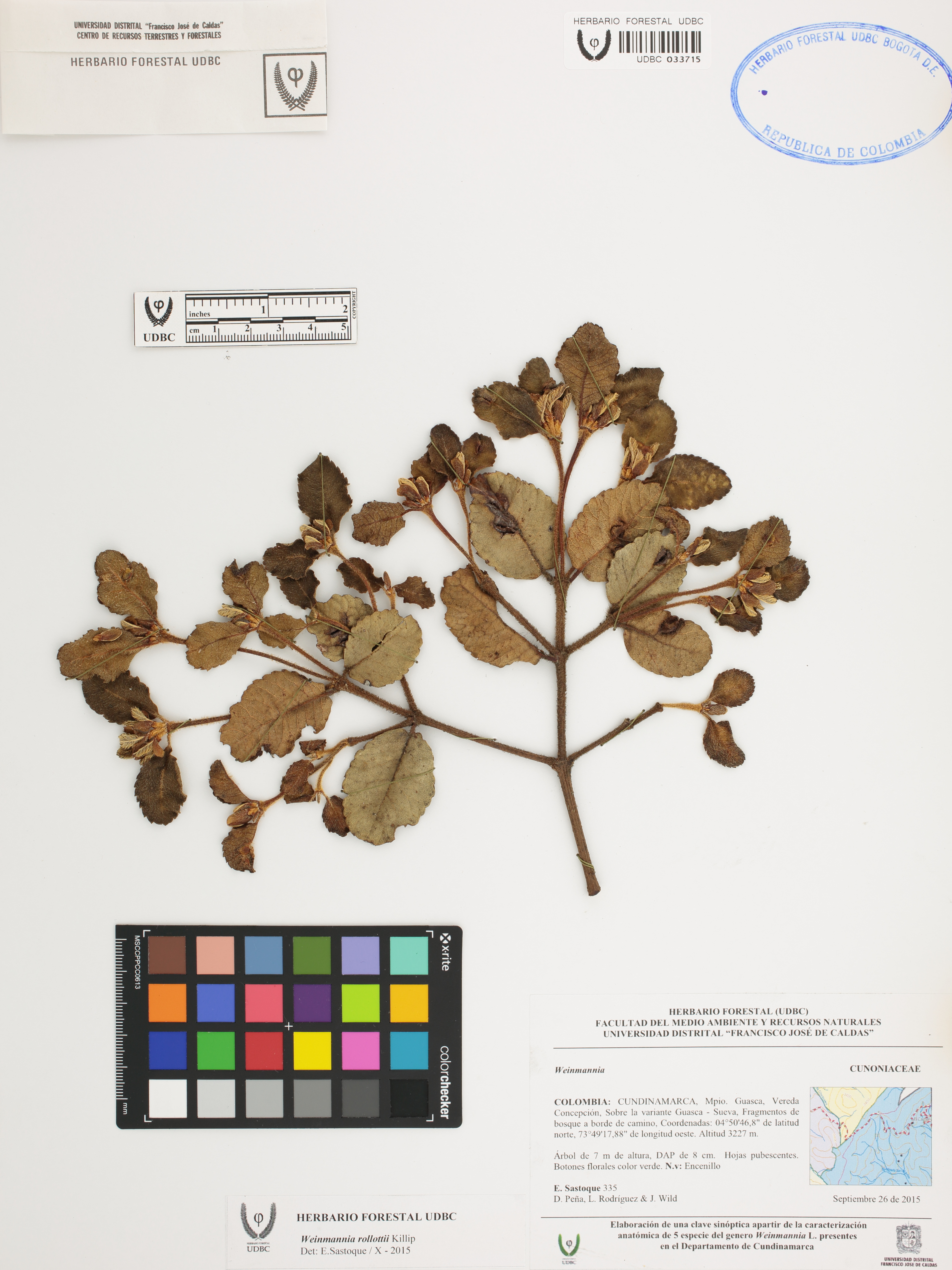 Fotografía del ejemplar Sastoque, E. 335, determinado como Weinmannia rollottii en el año 2015