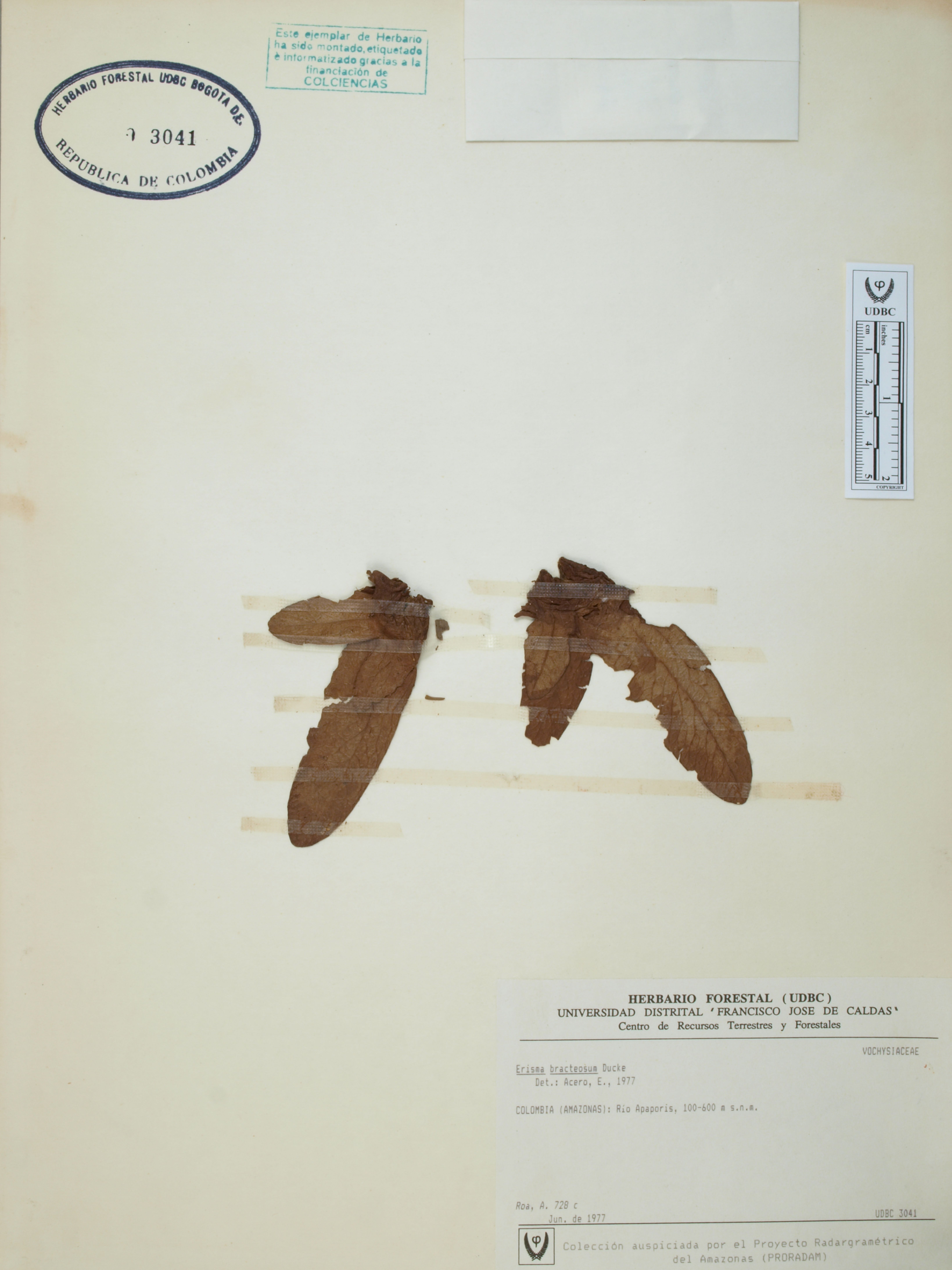 Fotografía del ejemplar Roa, A., determinado como Erisma bracteosum en el año 1977