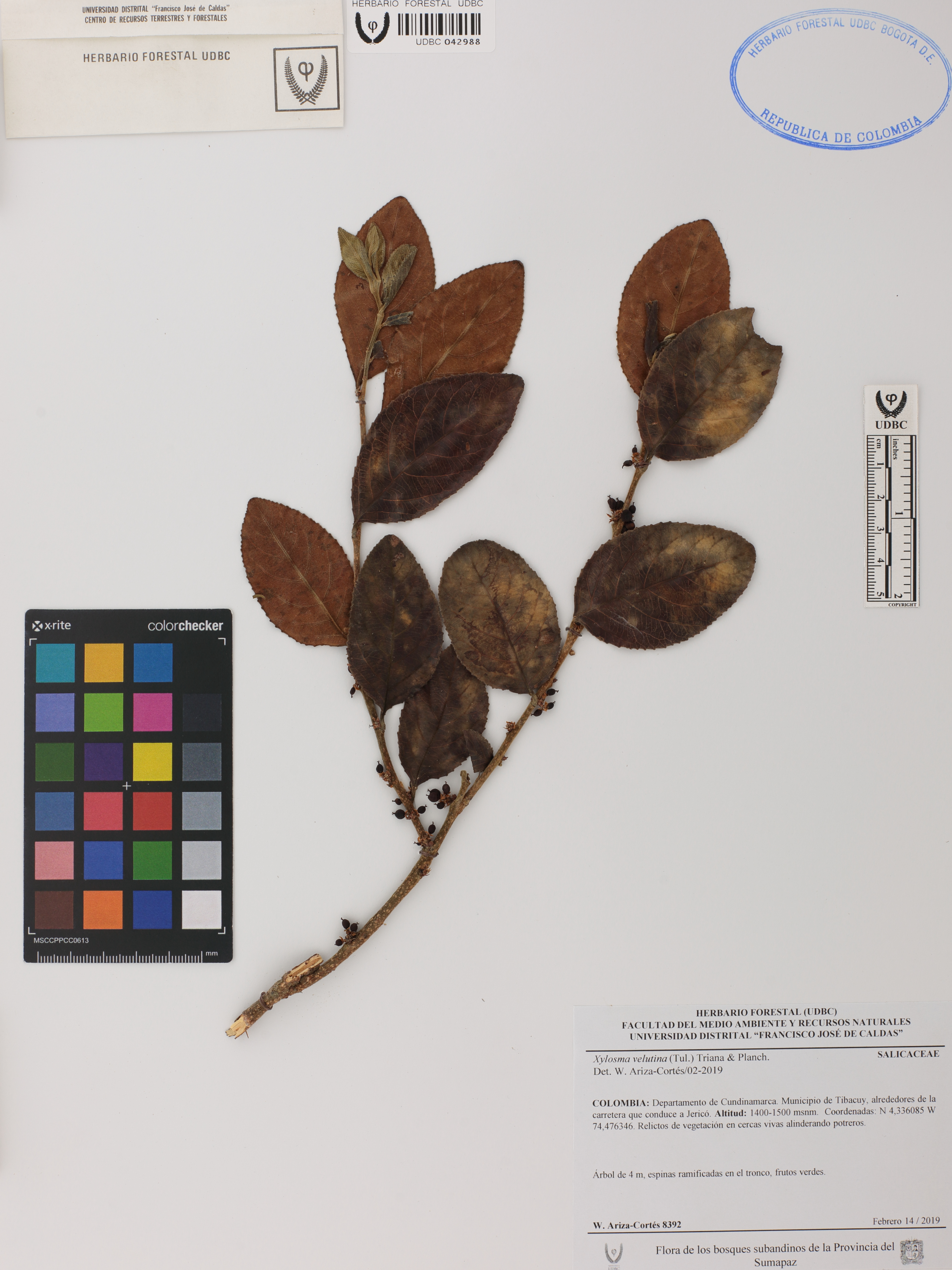 Fotografía del ejemplar Ariza-Cortés, W. 8392, determinado como Xylosma velutina en el año 2019