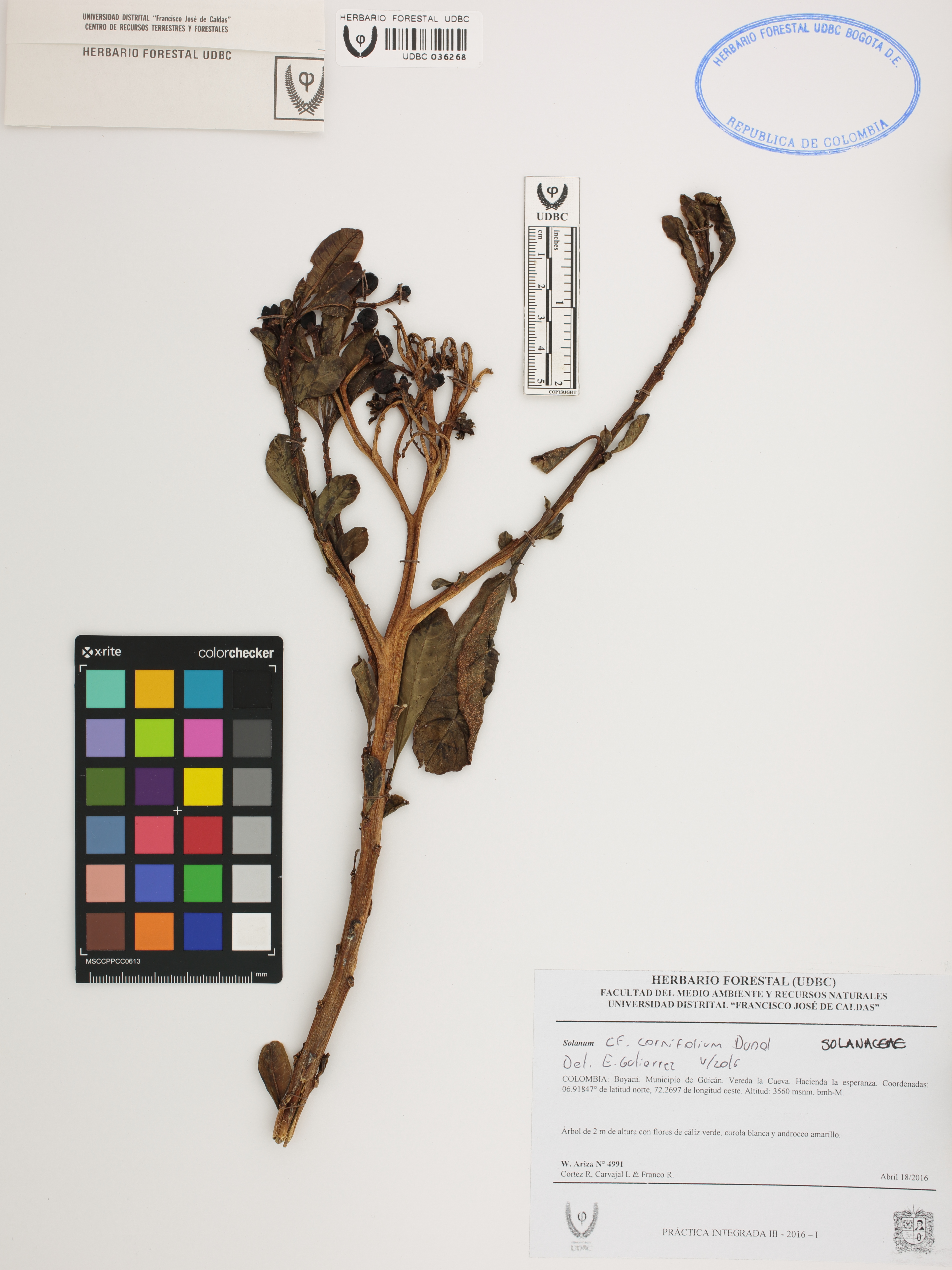 Fotografía del ejemplar Ariza, W. 4991, determinado como Solanum cornifolium en el año 2016