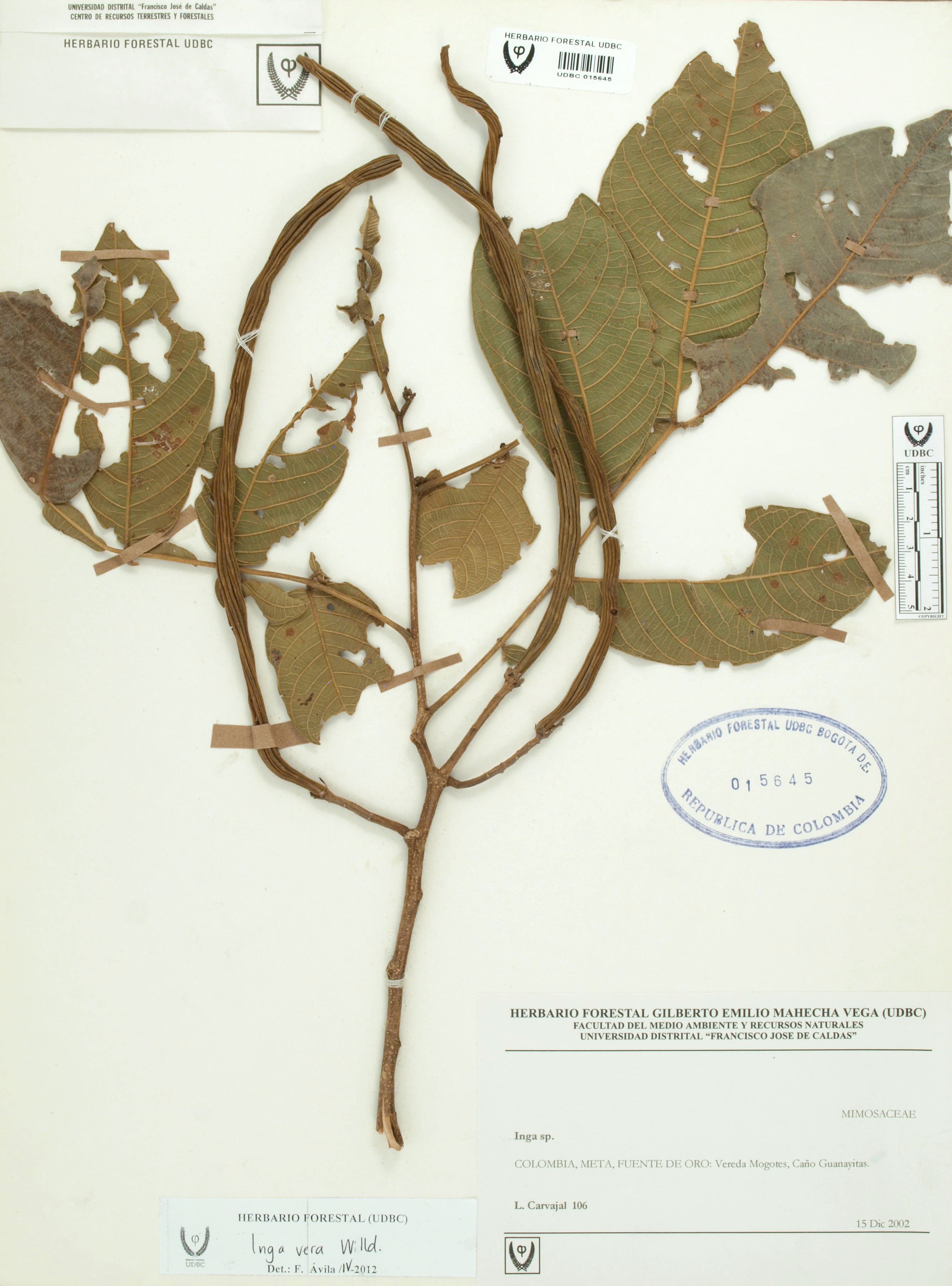 | dc.description | Fotografía del ejemplar Carvajal, L. 106, determinado como Inga vera en el año 2012 | |