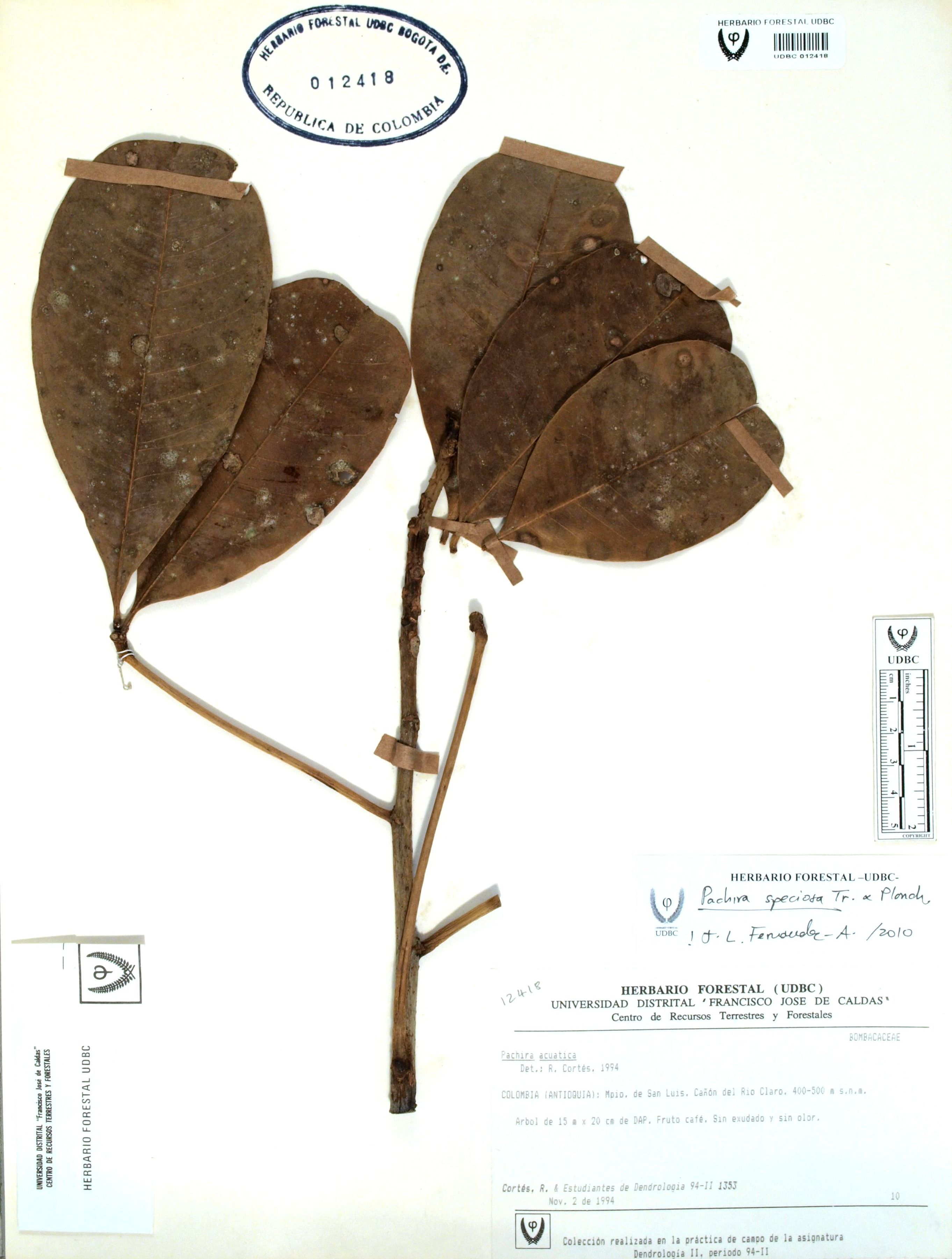Fotografía del ejemplar Cortés-B., R. 1353, determinado como Pachira speciosa en el año 2010