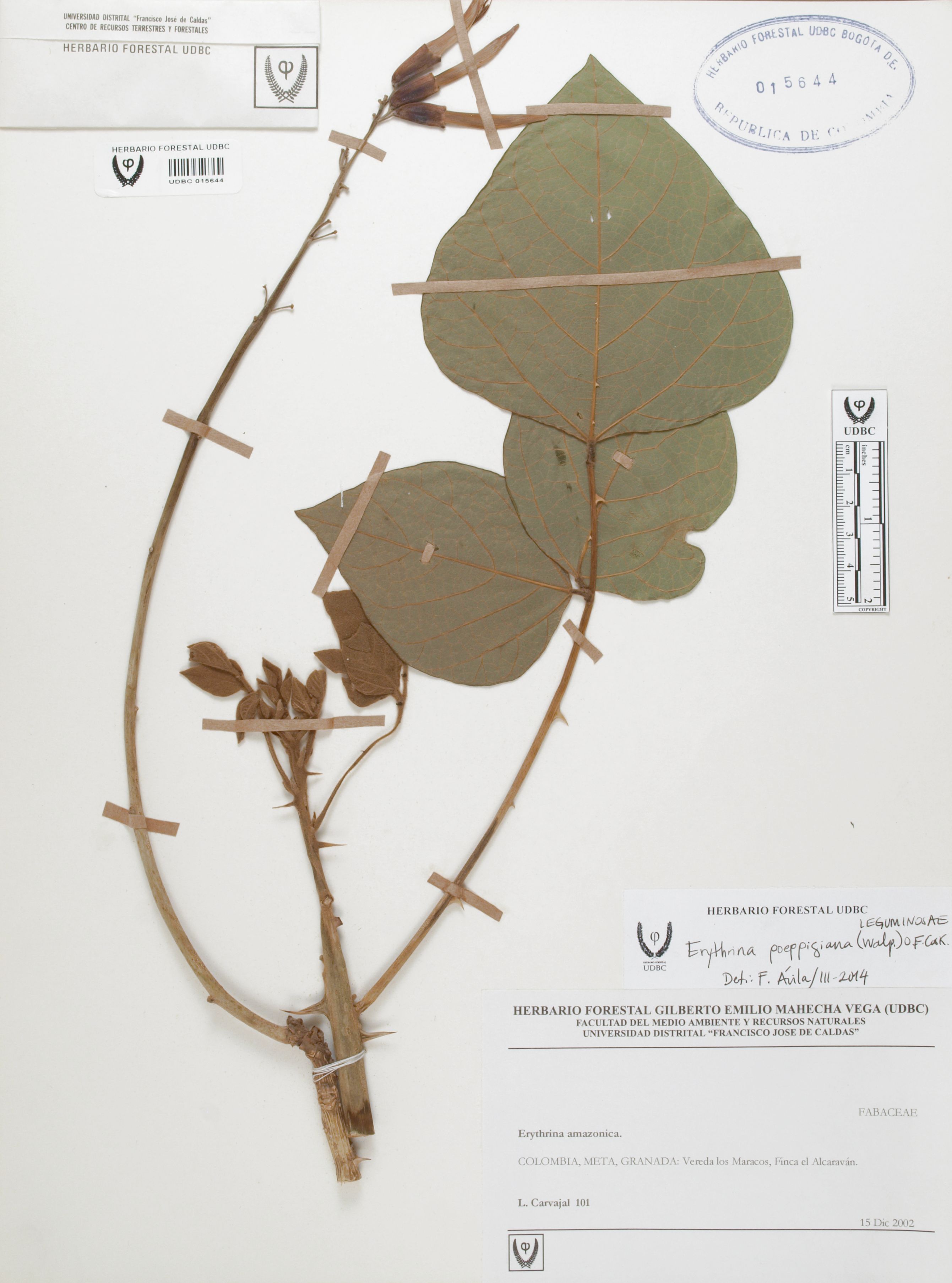 Fotografía del ejemplar Carvajal, L. 101, determinado como Erythrina amazonica en el año 2002