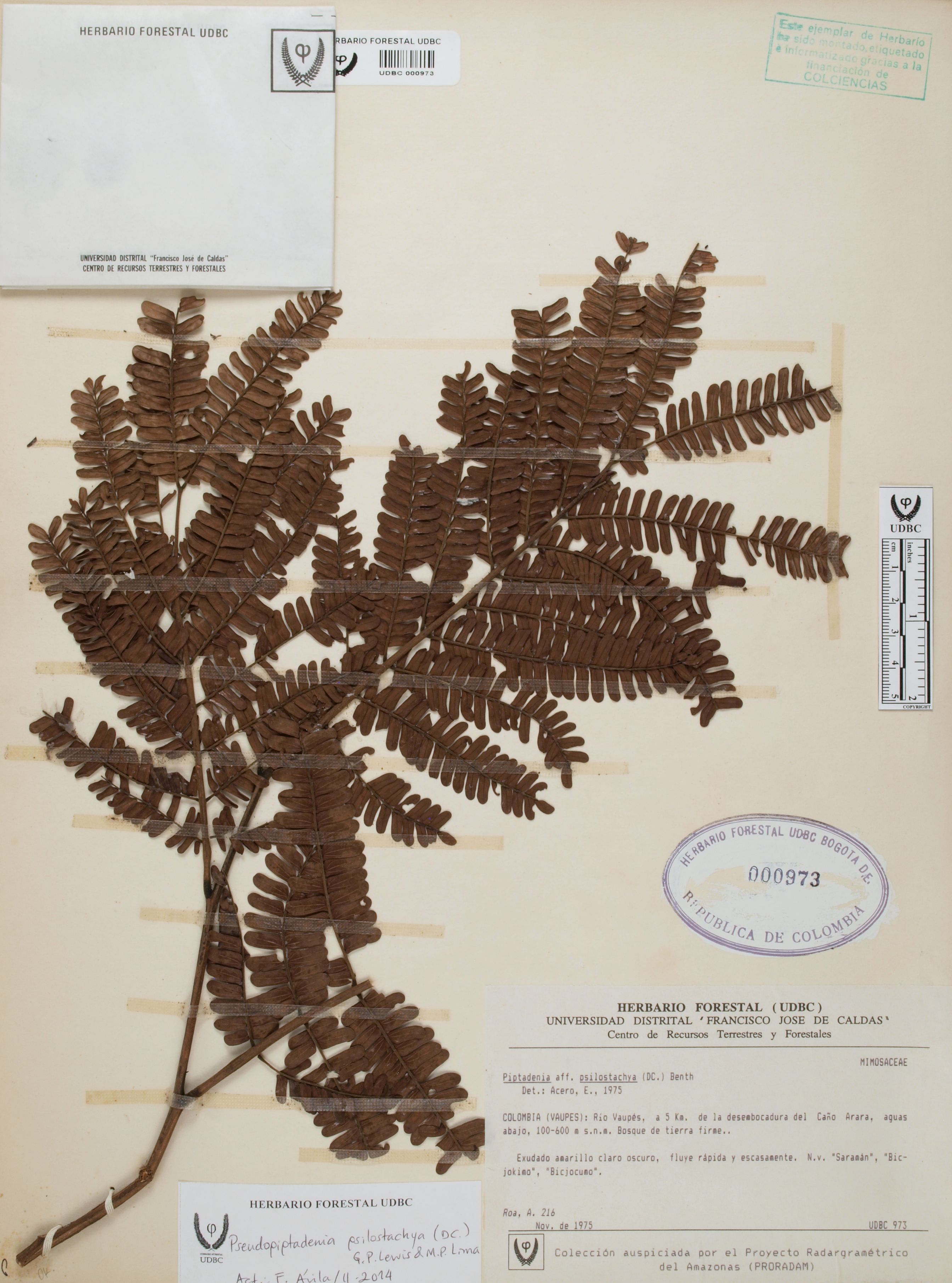 Fotografía del ejemplar Roa, A. 216, determinado como Pseudopiptadenia psilostachya en el año 2014