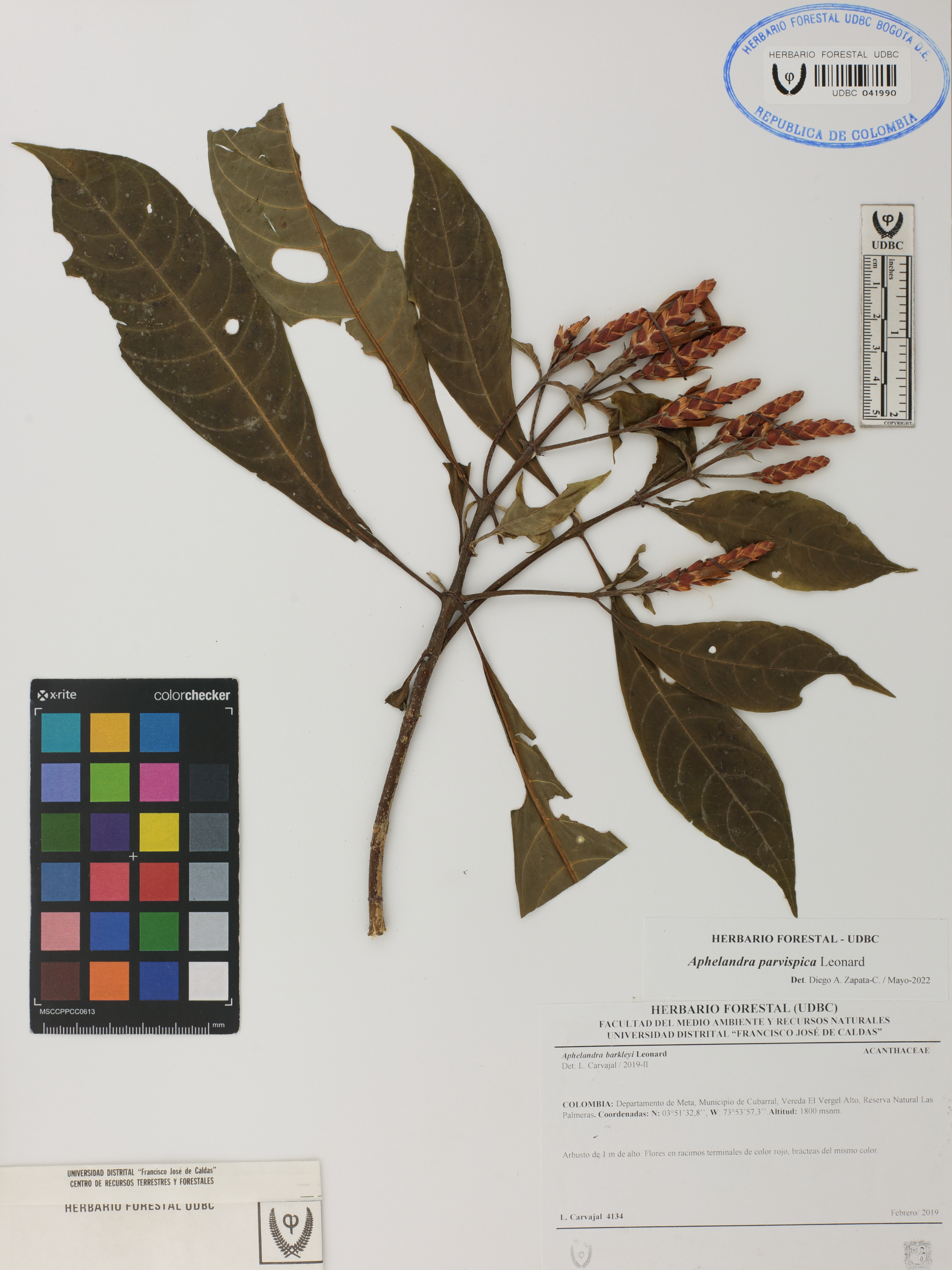 Fotografía del ejemplar Carvajal, L. 4134, determinado como Aphelandra parvispica en el año 2022