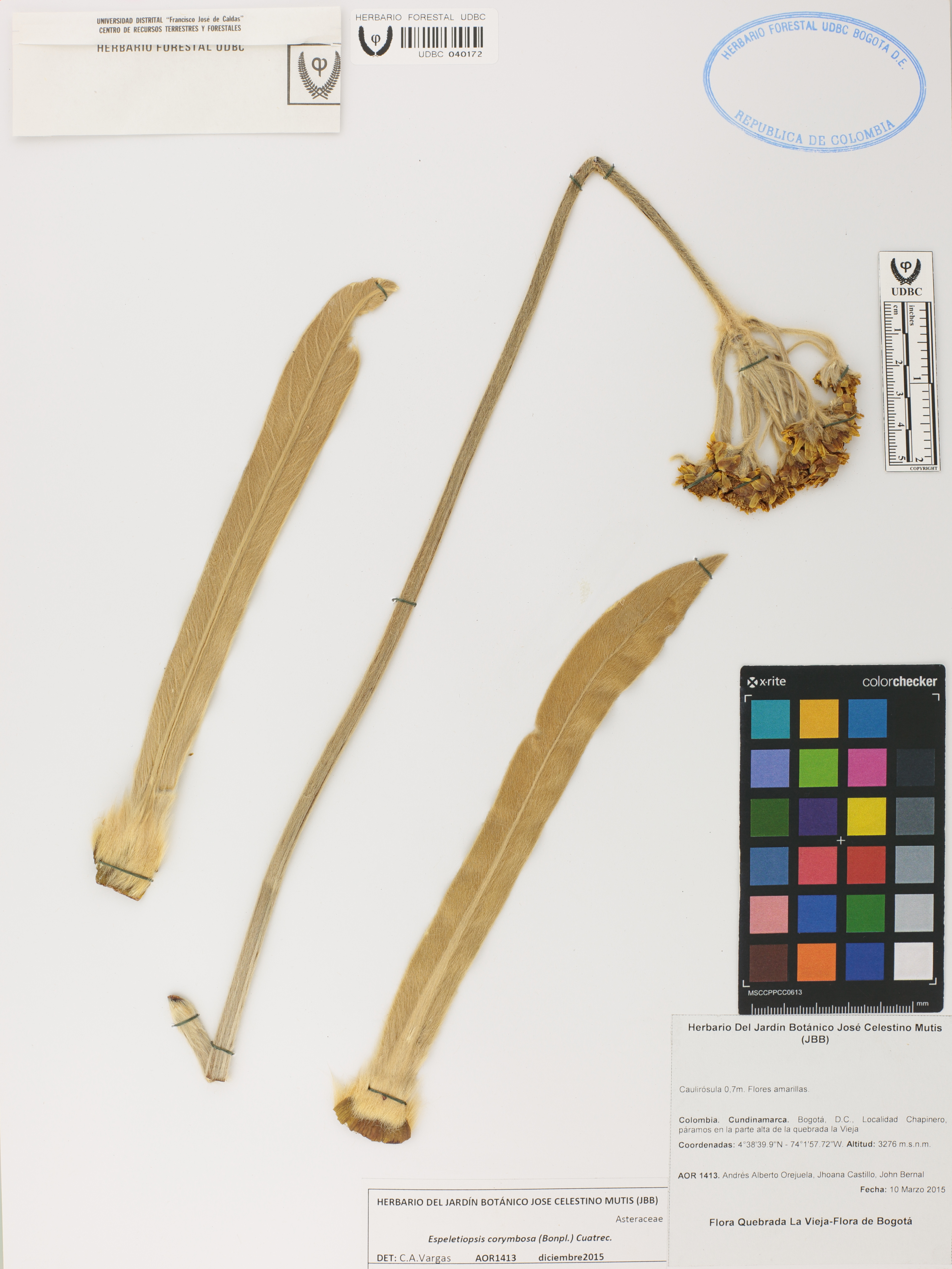 Fotografía del ejemplar Orejuela, A. 1413, determinado como Espeletiopsis corymbosa en el año 2015