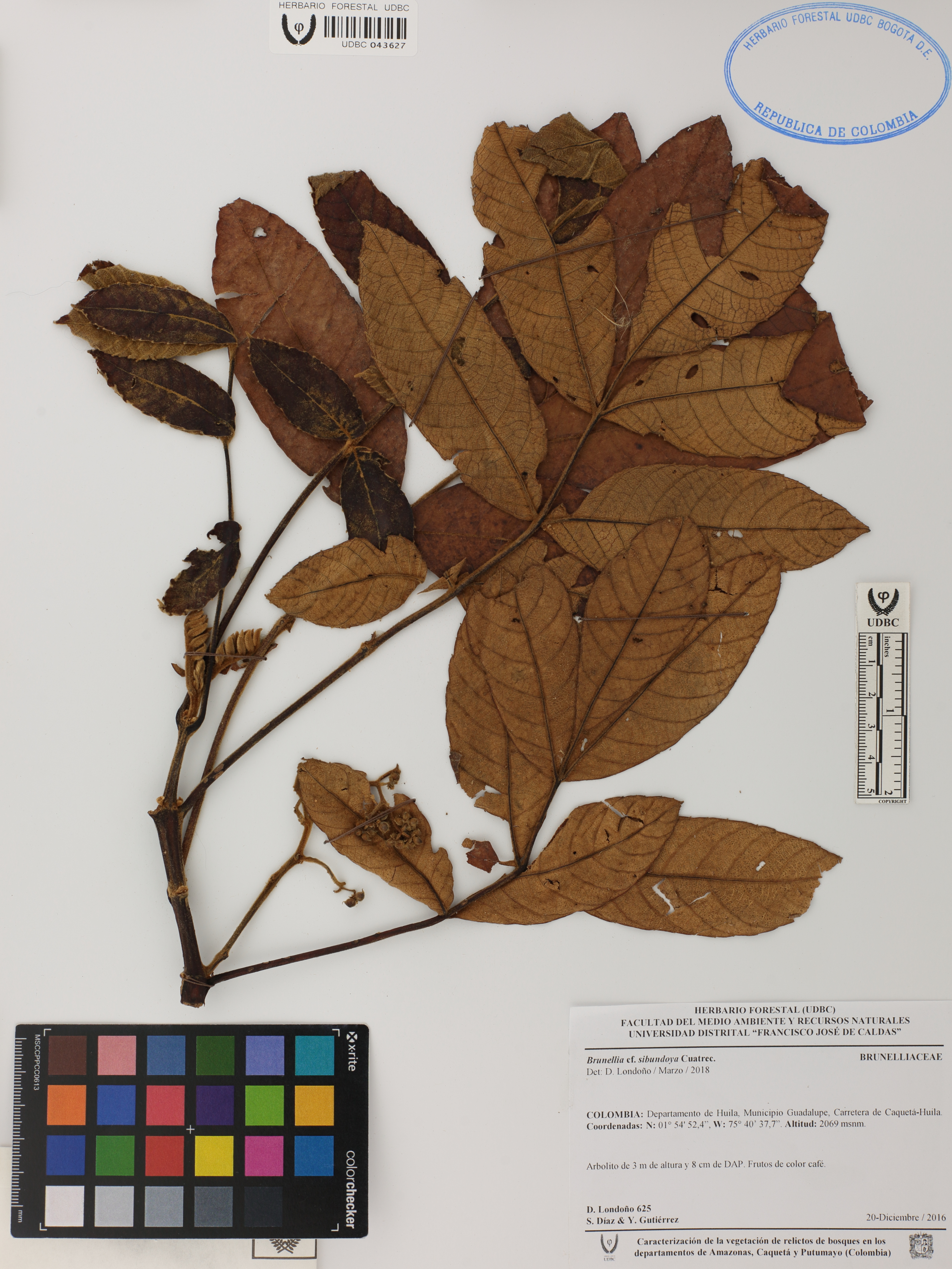 Fotografía del ejemplar Londoño, D. 625, determinado como Brunellia sibundoya en el año 2018