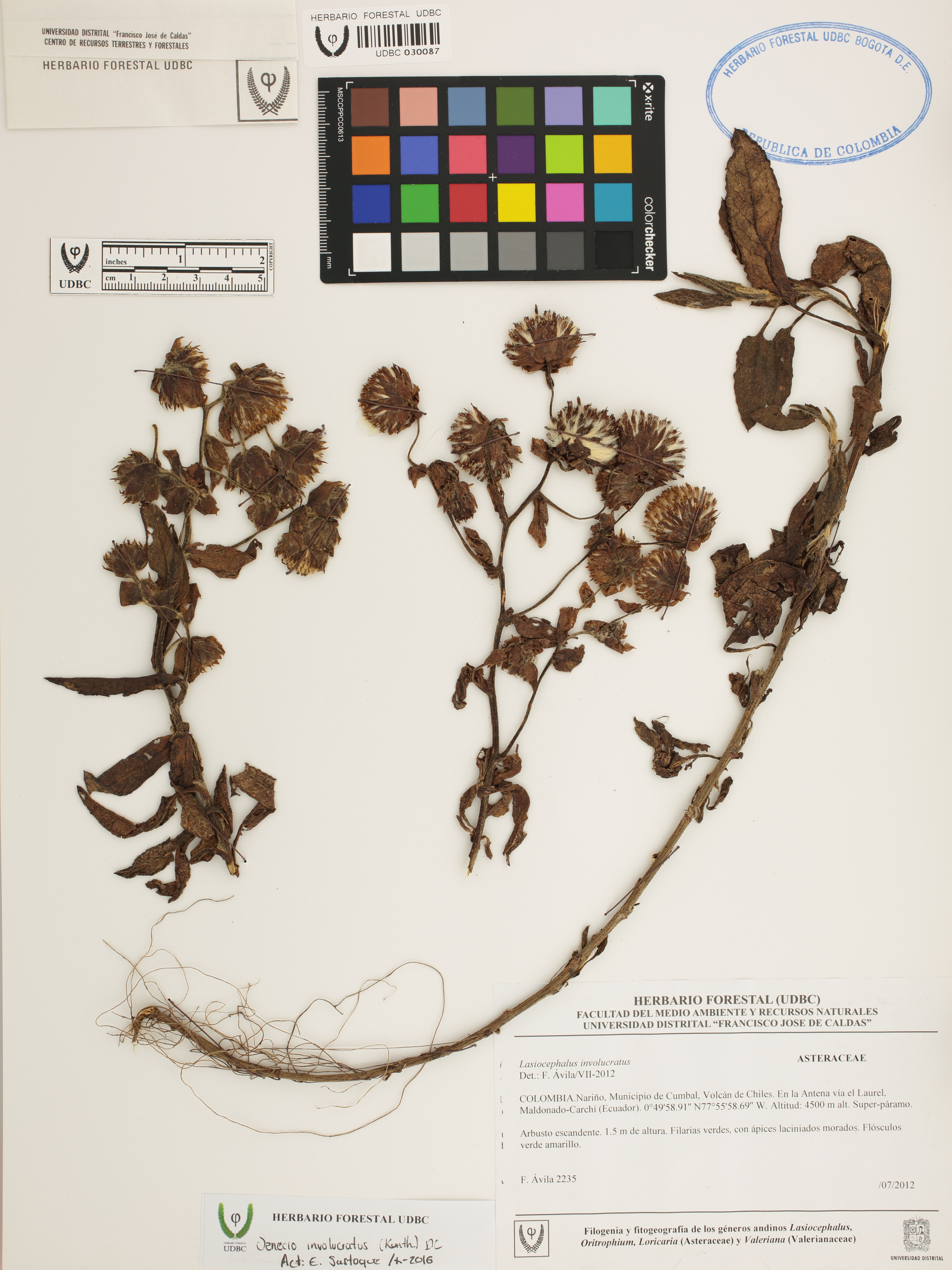 Fotografía del ejemplar Ávila, F. 2235, determinado como Senecio involucratus en el año 2012