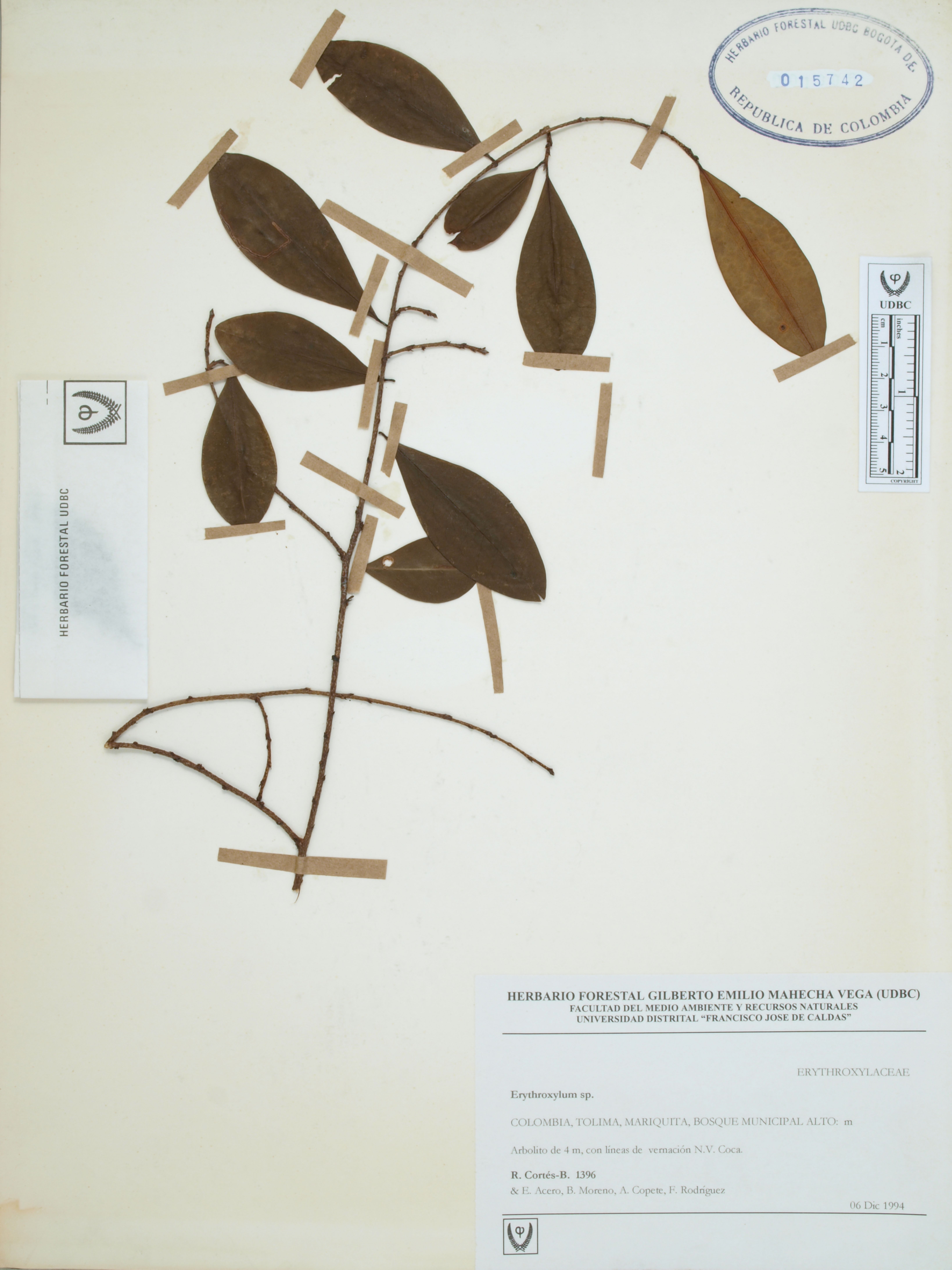 Fotografía del ejemplar Cortés-B., R. 1396, determinado como Erythroxylum cassinoides en el año 2009