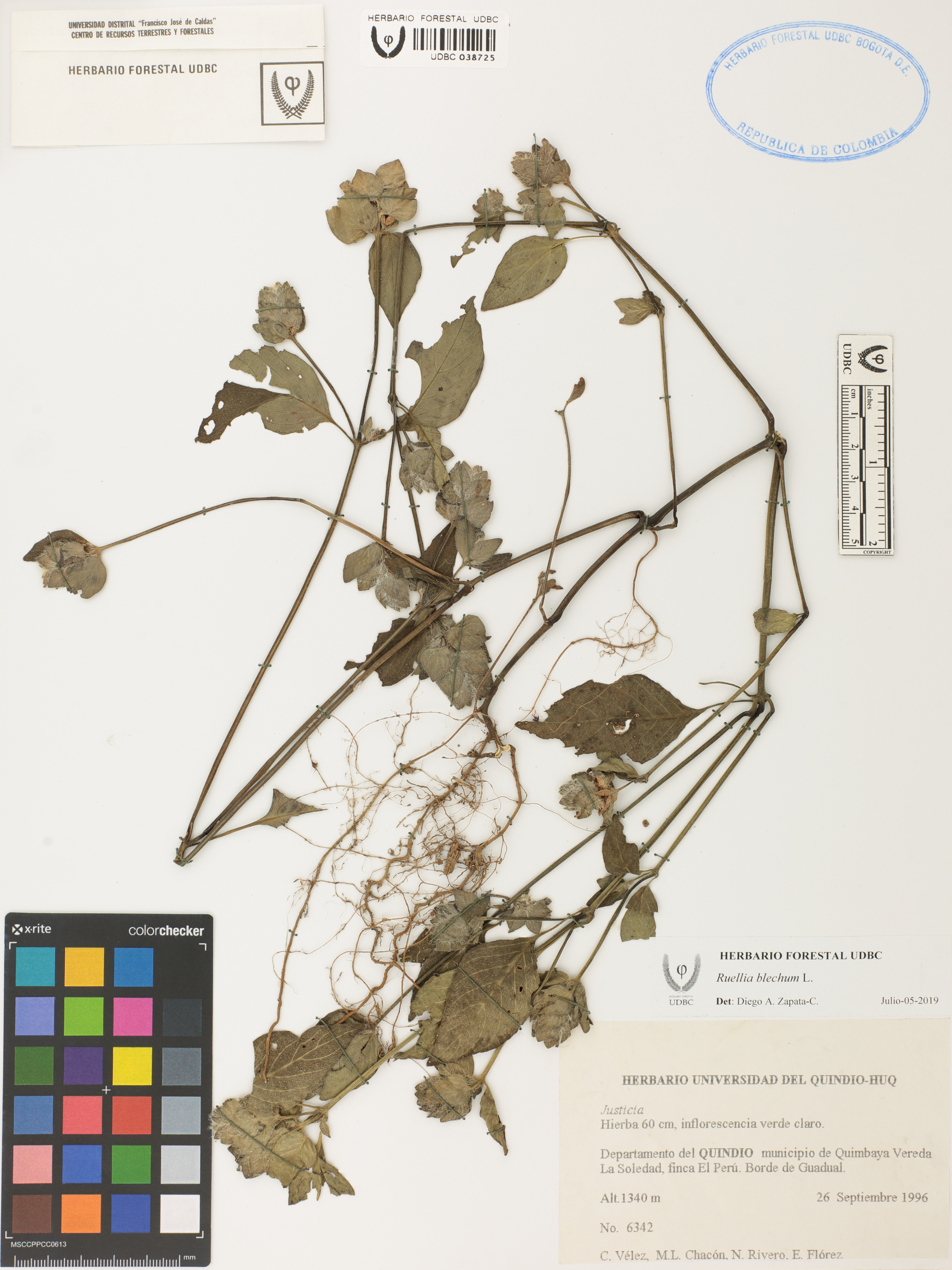 Fotografía del ejemplar Vélez, C. 6342, determinado como Ruellia blechum en el año 2019