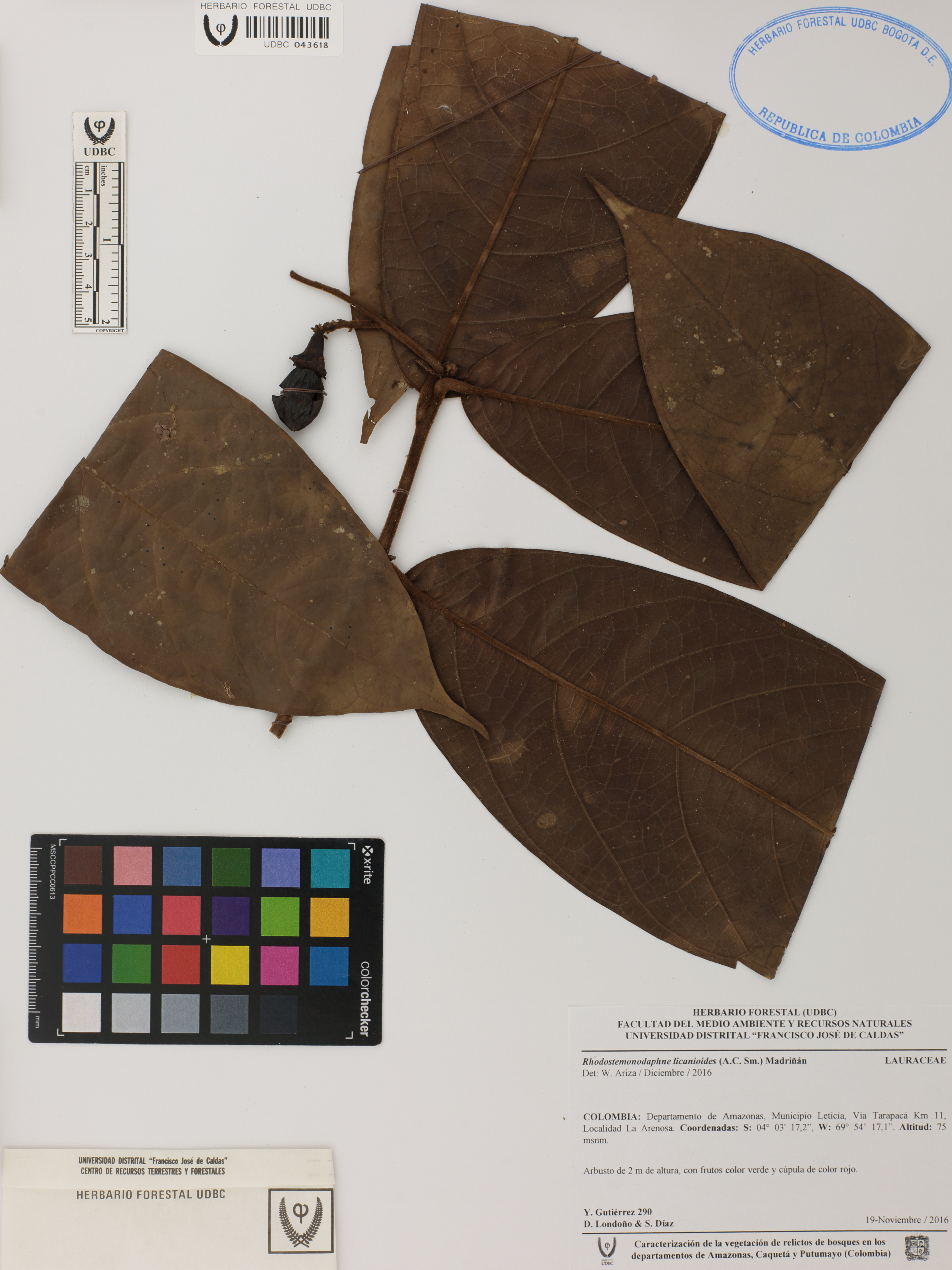 Fotografía del ejemplar Gutiérrez, Y. 290, determinado como Rhodostemonodaphne licanioides en el año 2016
