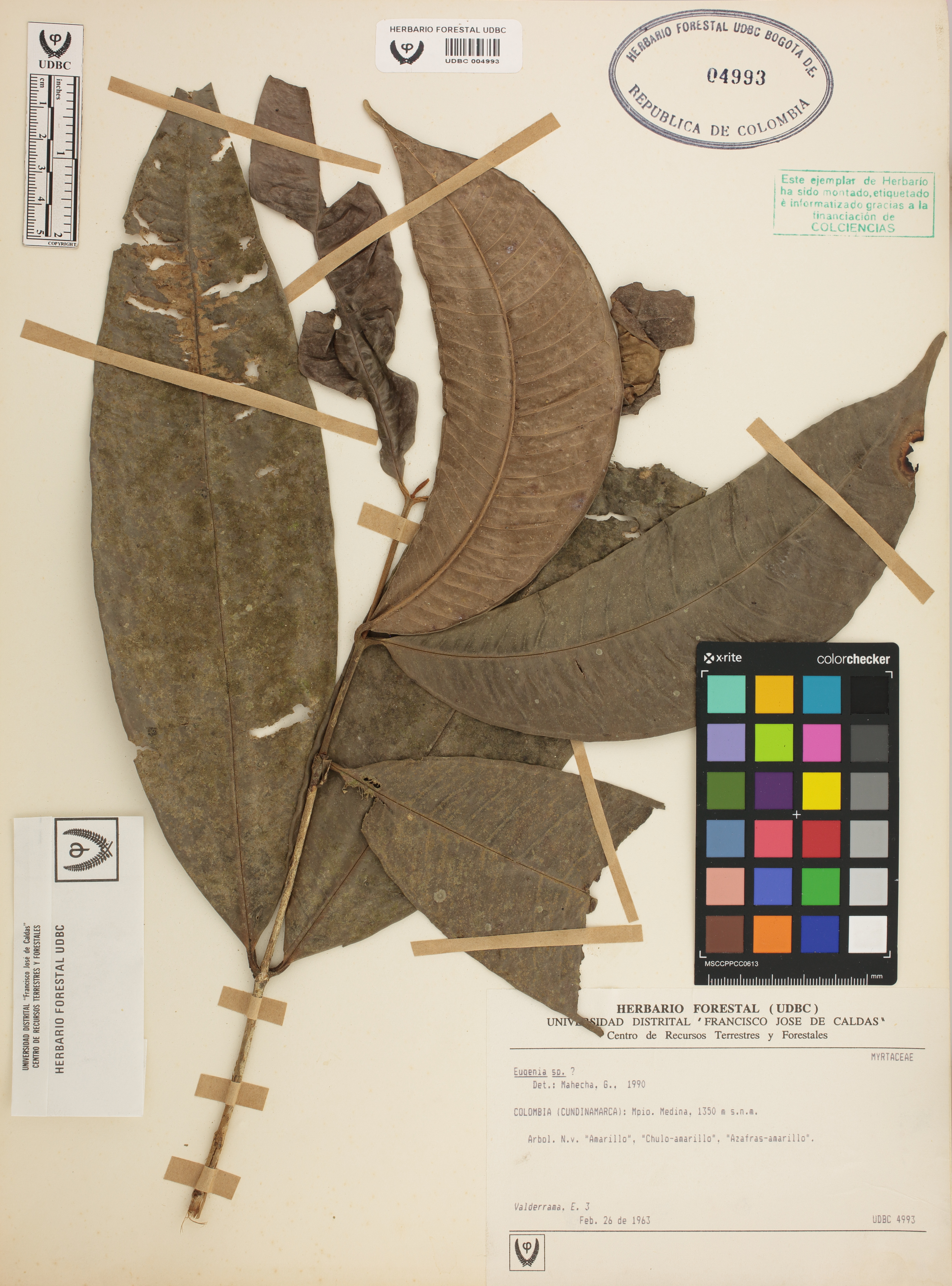 Fotografía del ejemplar Valderrama, E. 3, determinado como Eugenia sp. en el año 1990