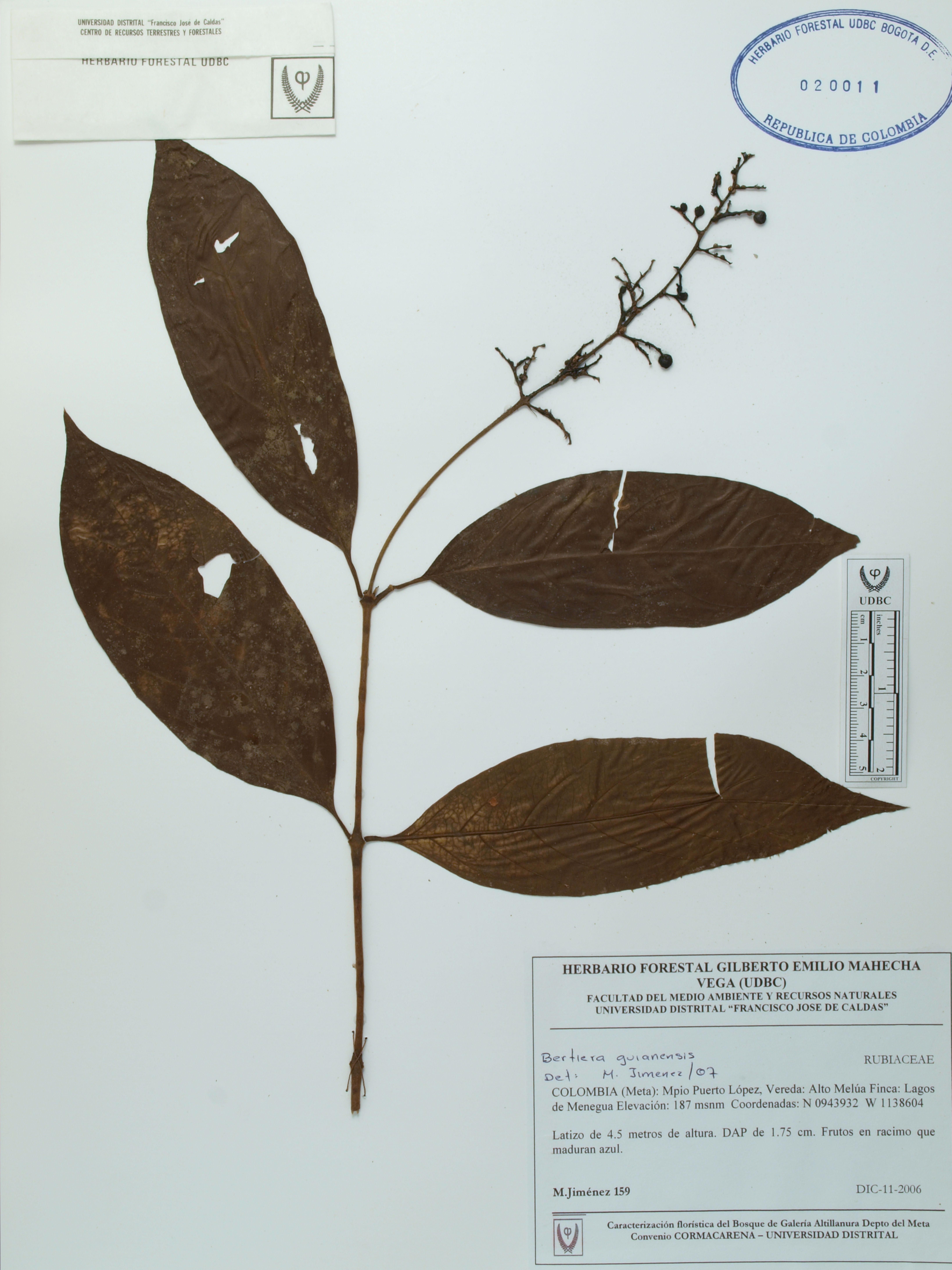 Fotografía del ejemplar Jiménez, M. 159, determinado como Bertiera guianensis en el año 2007