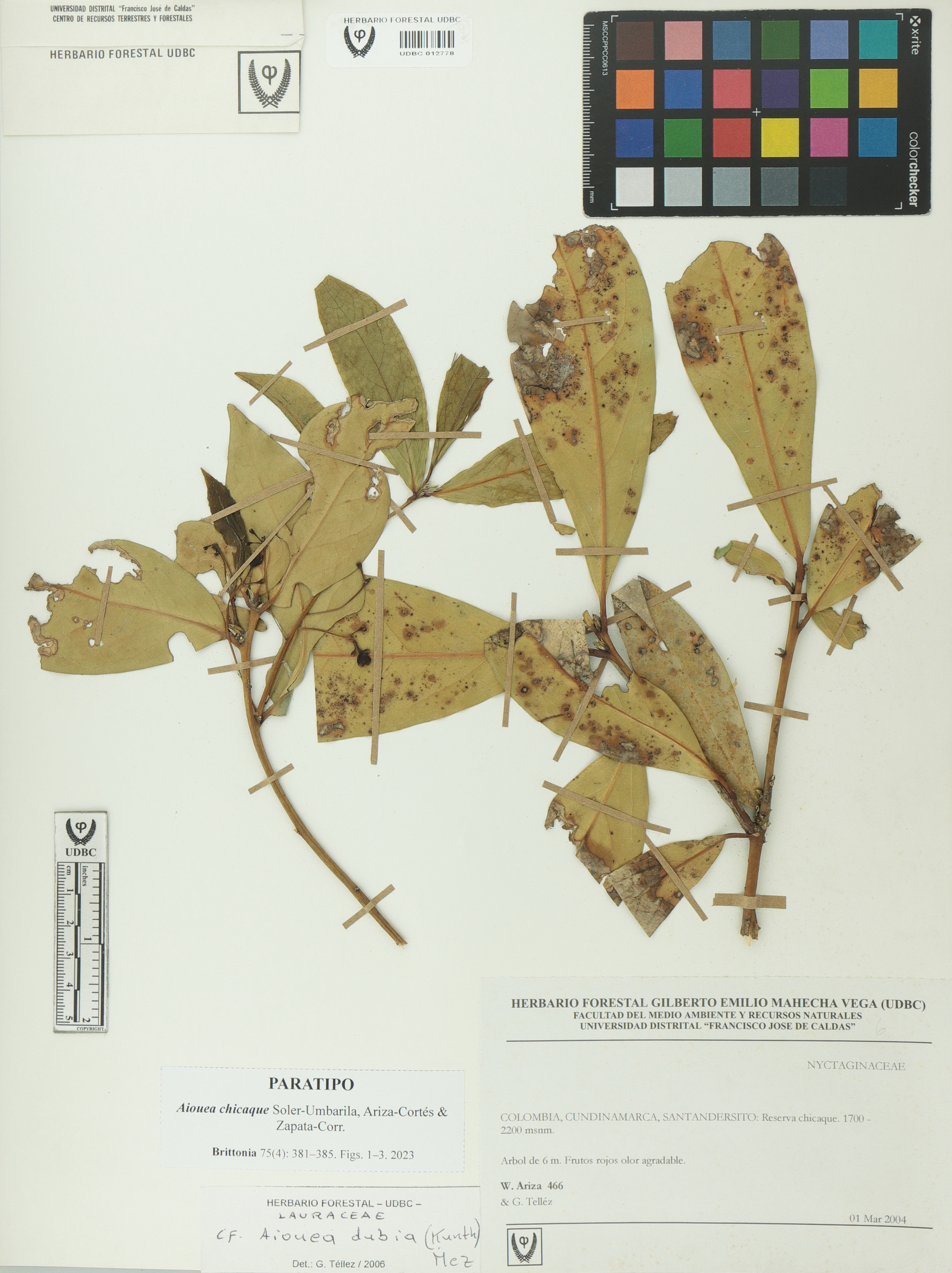| dc.description | Fotografía del ejemplar Ariza, W. 466, Paratipo de Aiouea chicaque | |