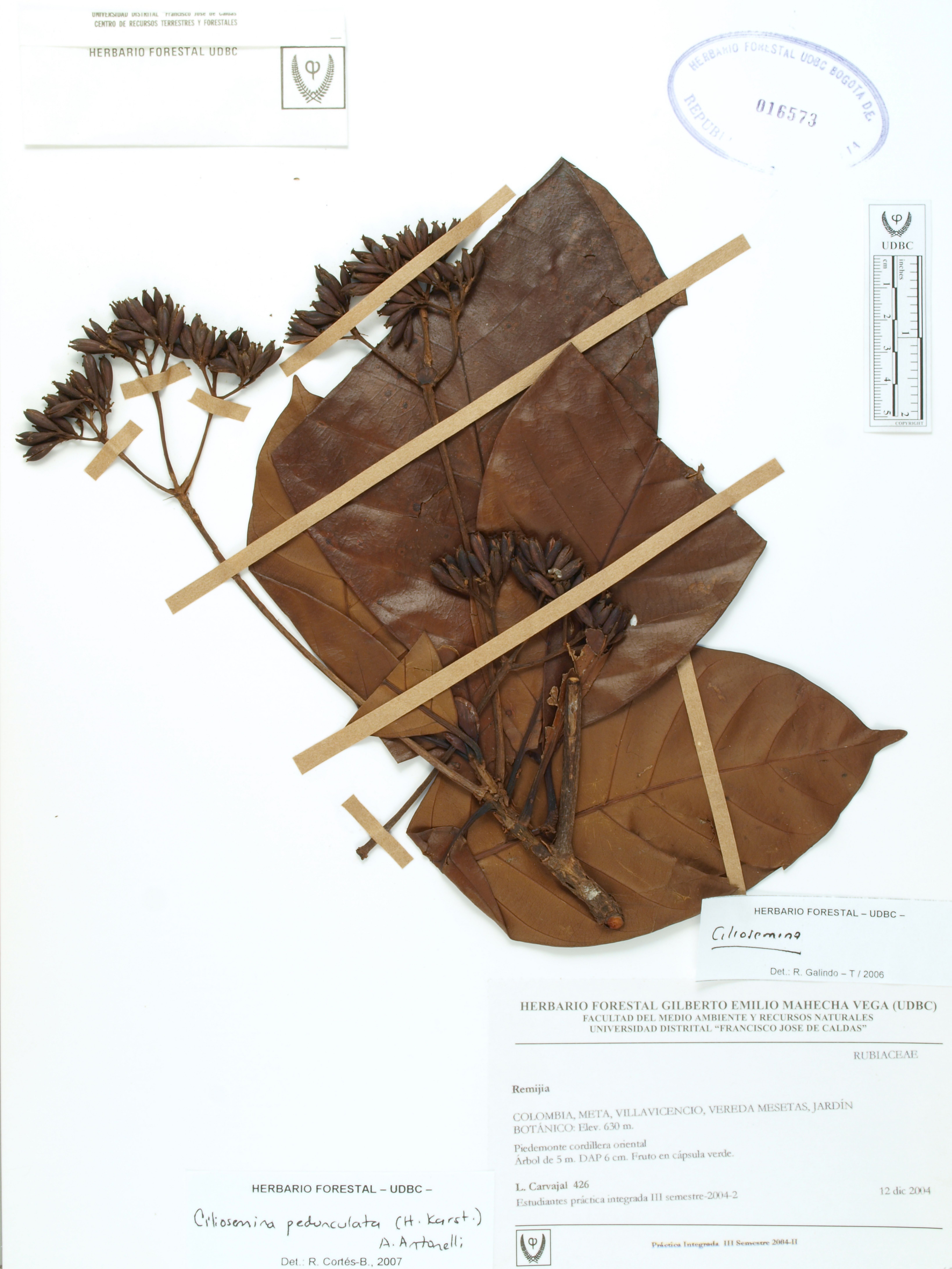 Fotografía del ejemplar Carvajal, L. 426, determinado como Ciliosemina pedunculata en el año 2007