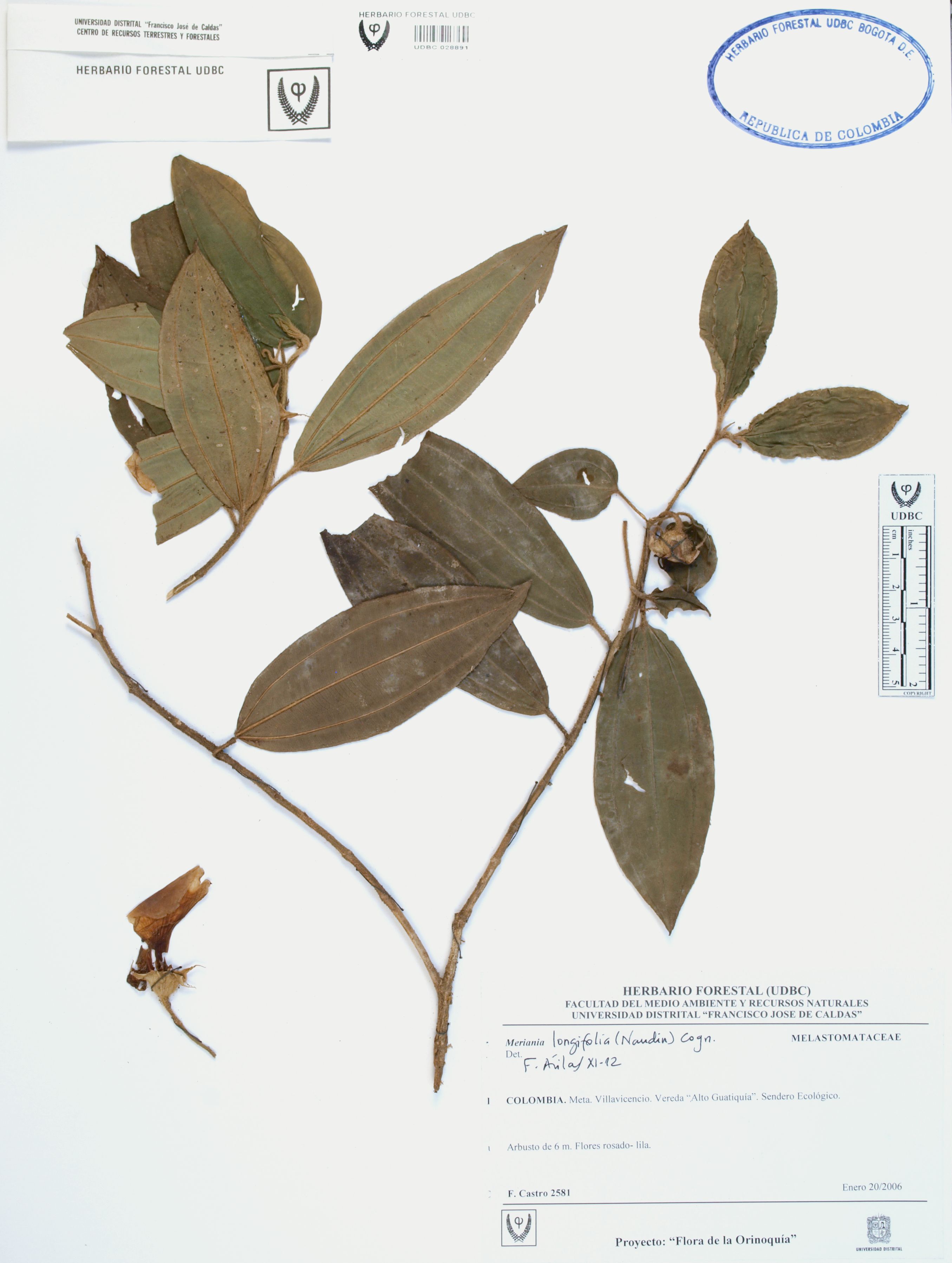 Fotografía del ejemplar Castro, F. 2581, determinado como Meriania longifolia en el año 2012