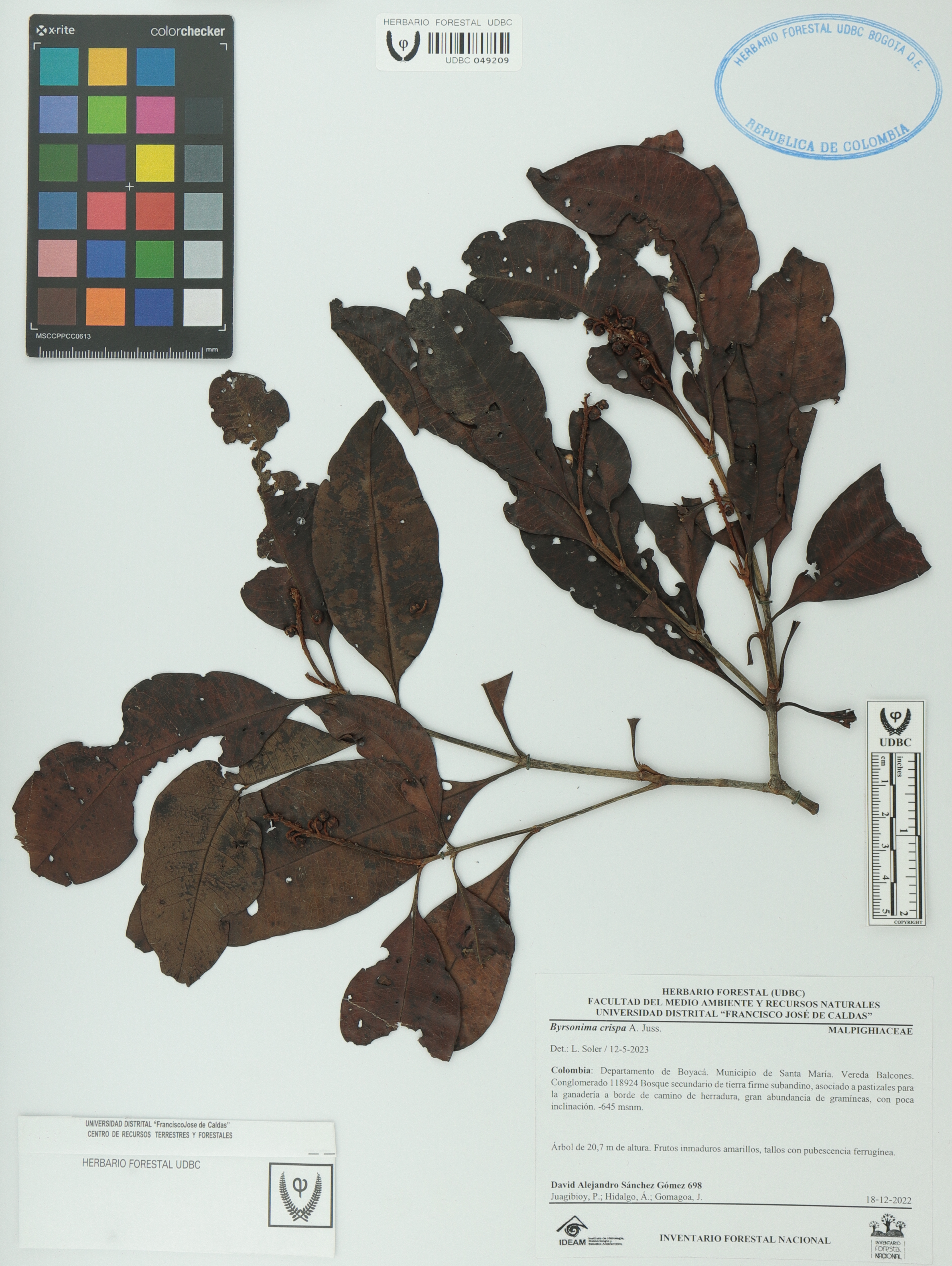 Fotografía del ejemplar Sánchez-Gómez, D. 698, determinado como Byrsonima crispa en el año 2023