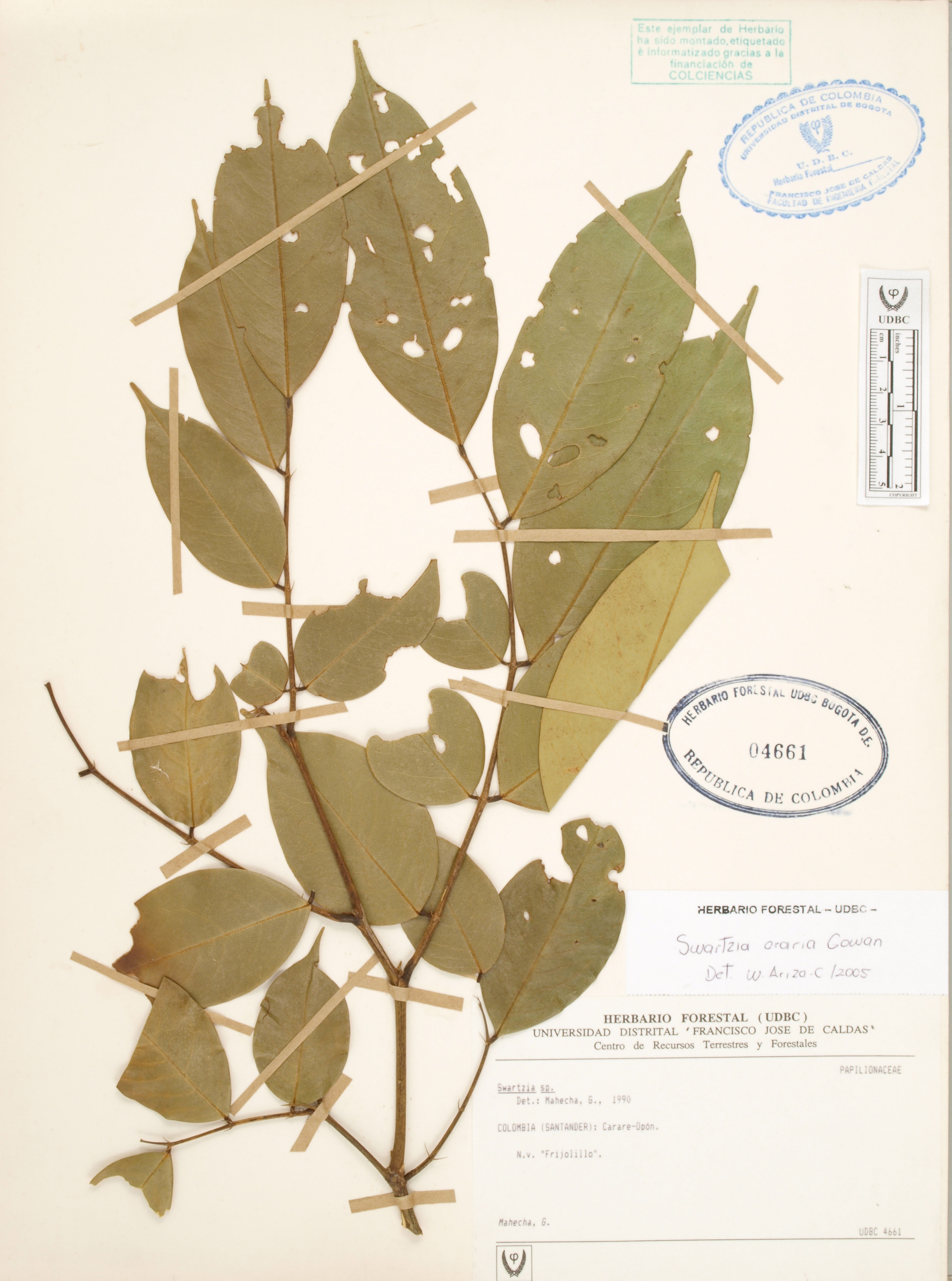 | dc.description | Fotografía del ejemplar Mahecha, G. 389, determinado como Swartzia oraria en el año 2005 | |