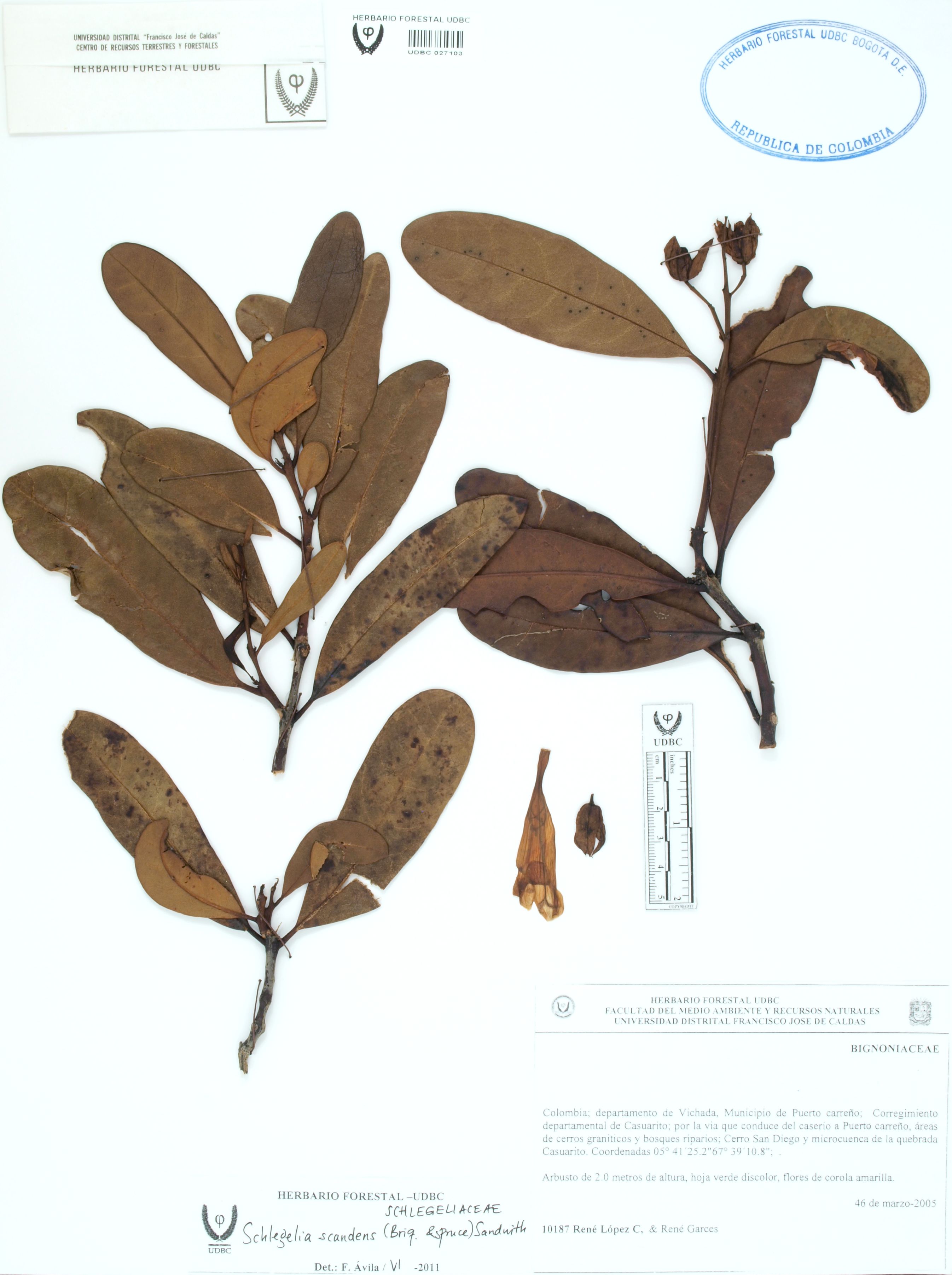 Fotografía del ejemplar López, R. 10187, determinado como Schlegelia scandens en el año 2011