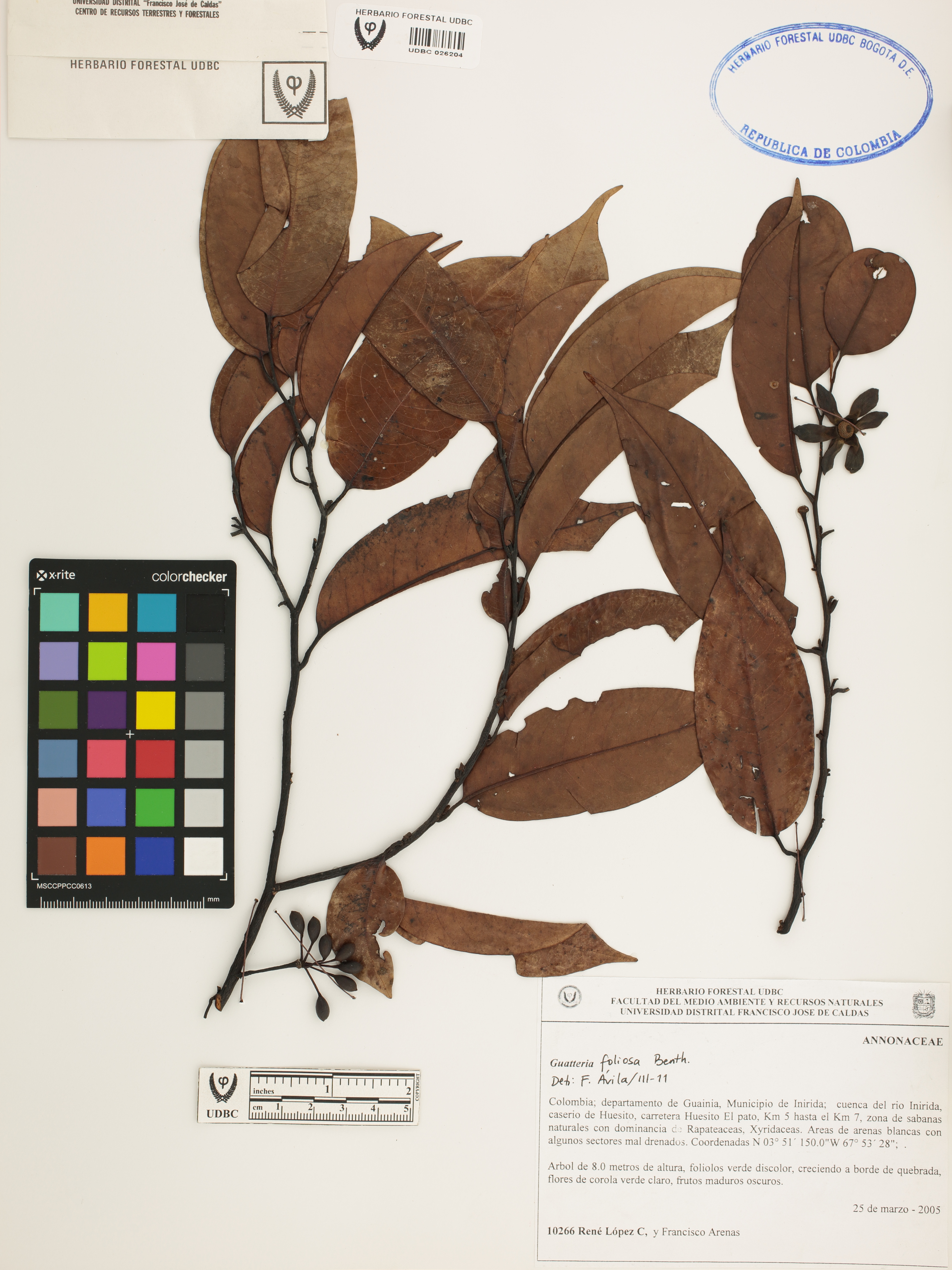 Fotografía del ejemplar López, R. 10266, determinado como Guatteria foliosa en el año 2011
