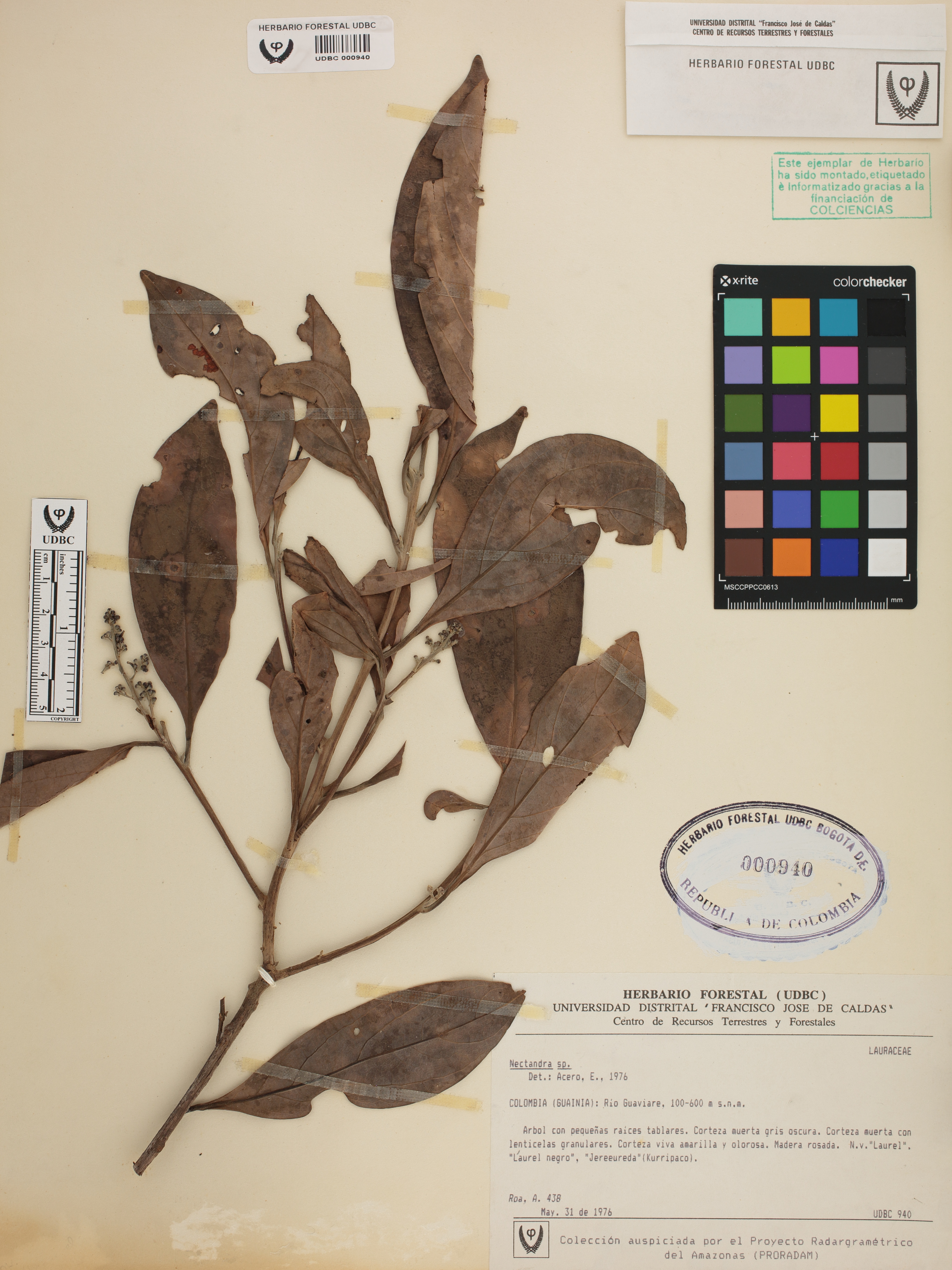Fotografía del ejemplar Roa, A. 438, determinado como Nectandra sp. en el año 1976