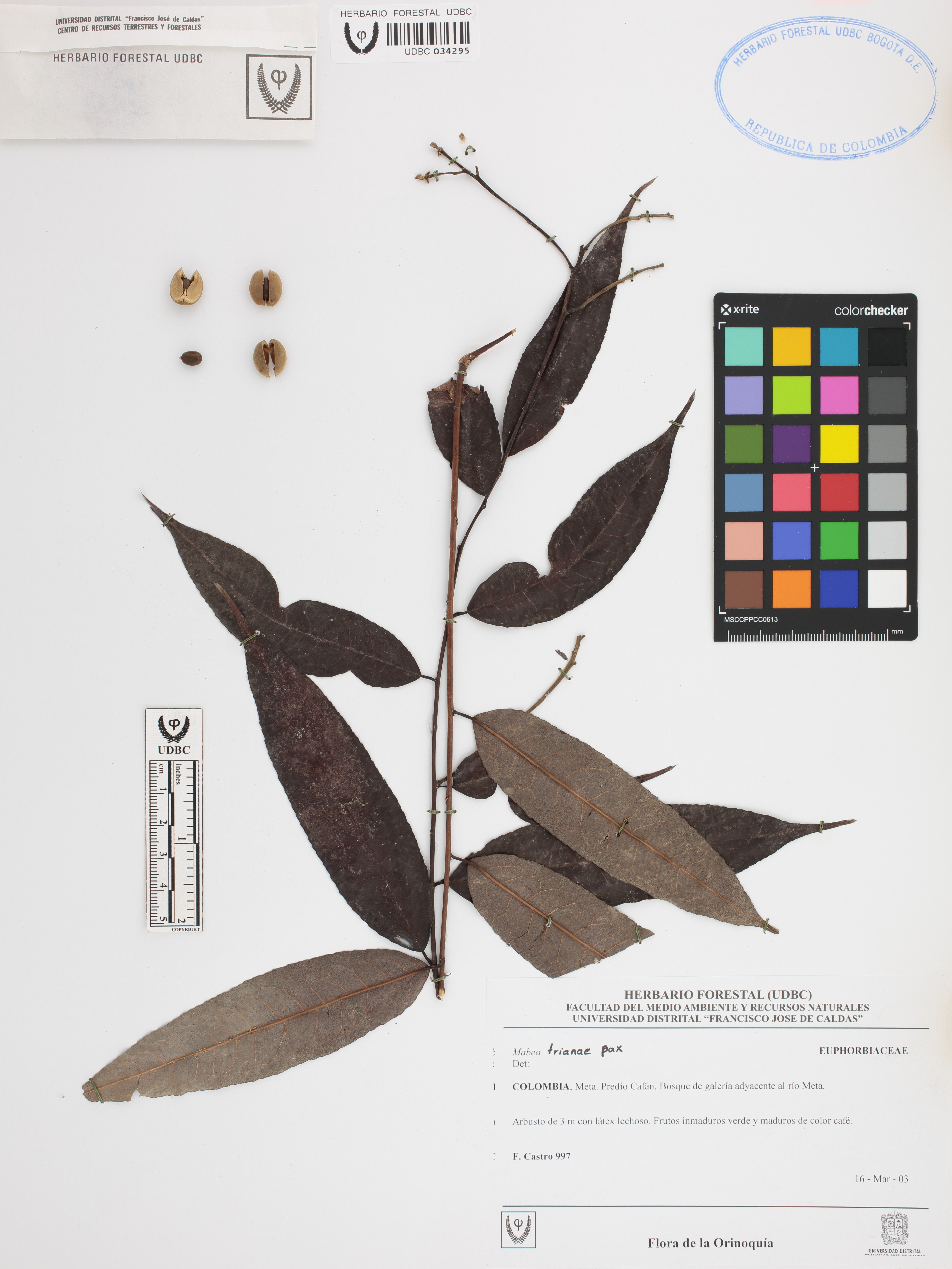 Fotografía del ejemplar Castro, F. 997, determinado como Mabea trianae