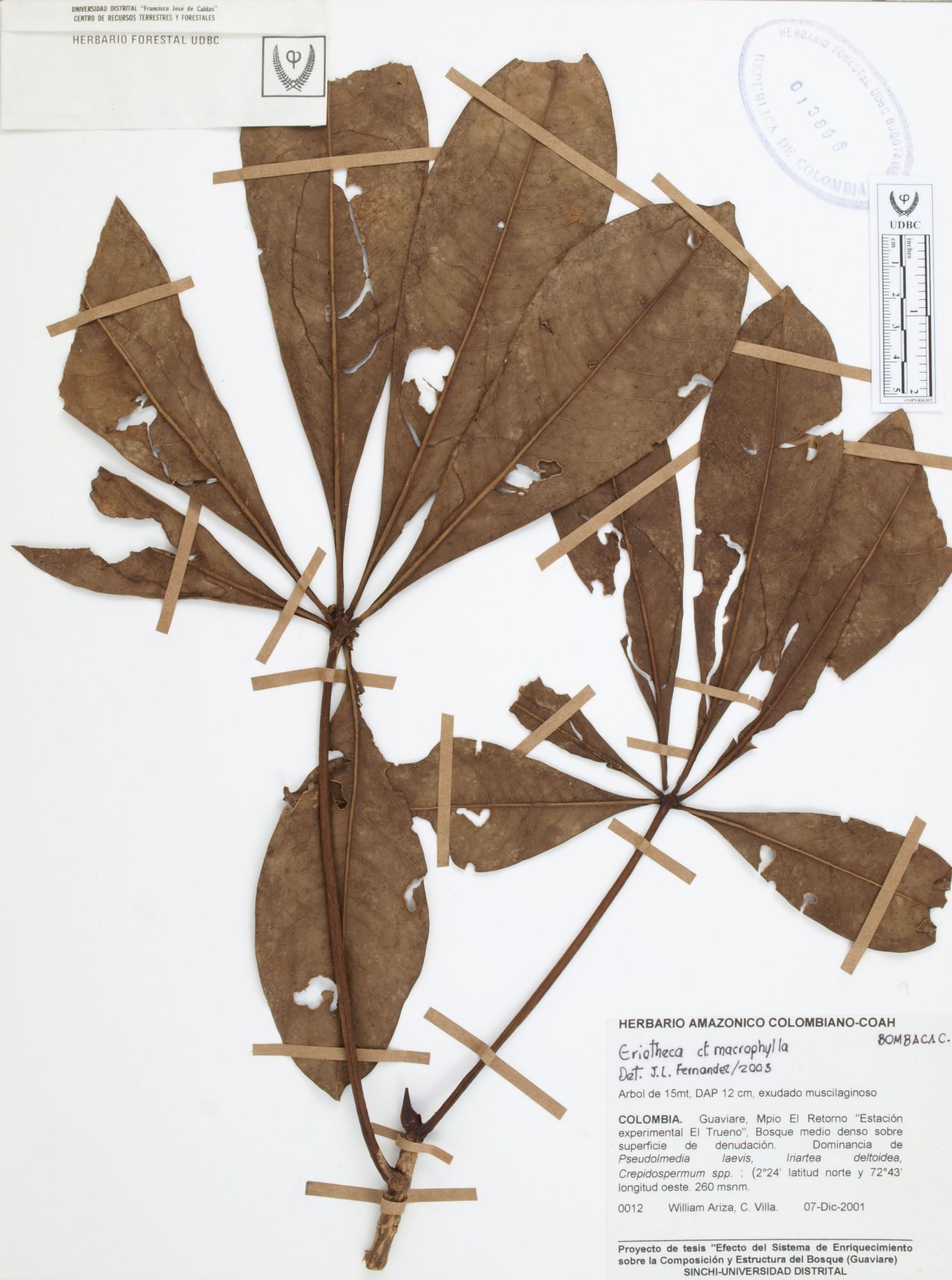 Fotografía del ejemplar Ariza, W. 12, determinado como Eriotheca macrophylla en el año 2003
