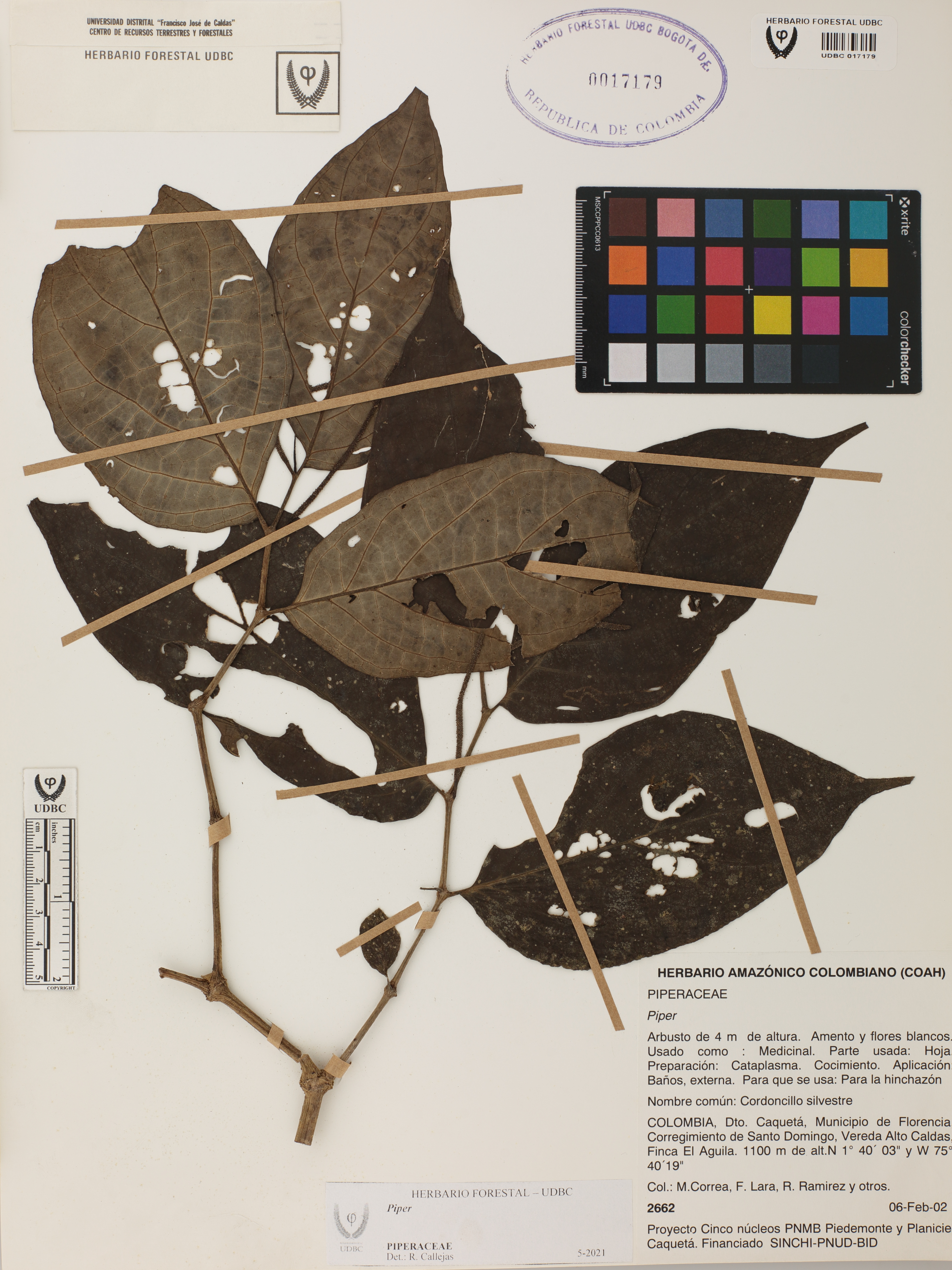 Fotografía del ejemplar Correa, M. 2662, determinado como Piper sp. en el año 2024