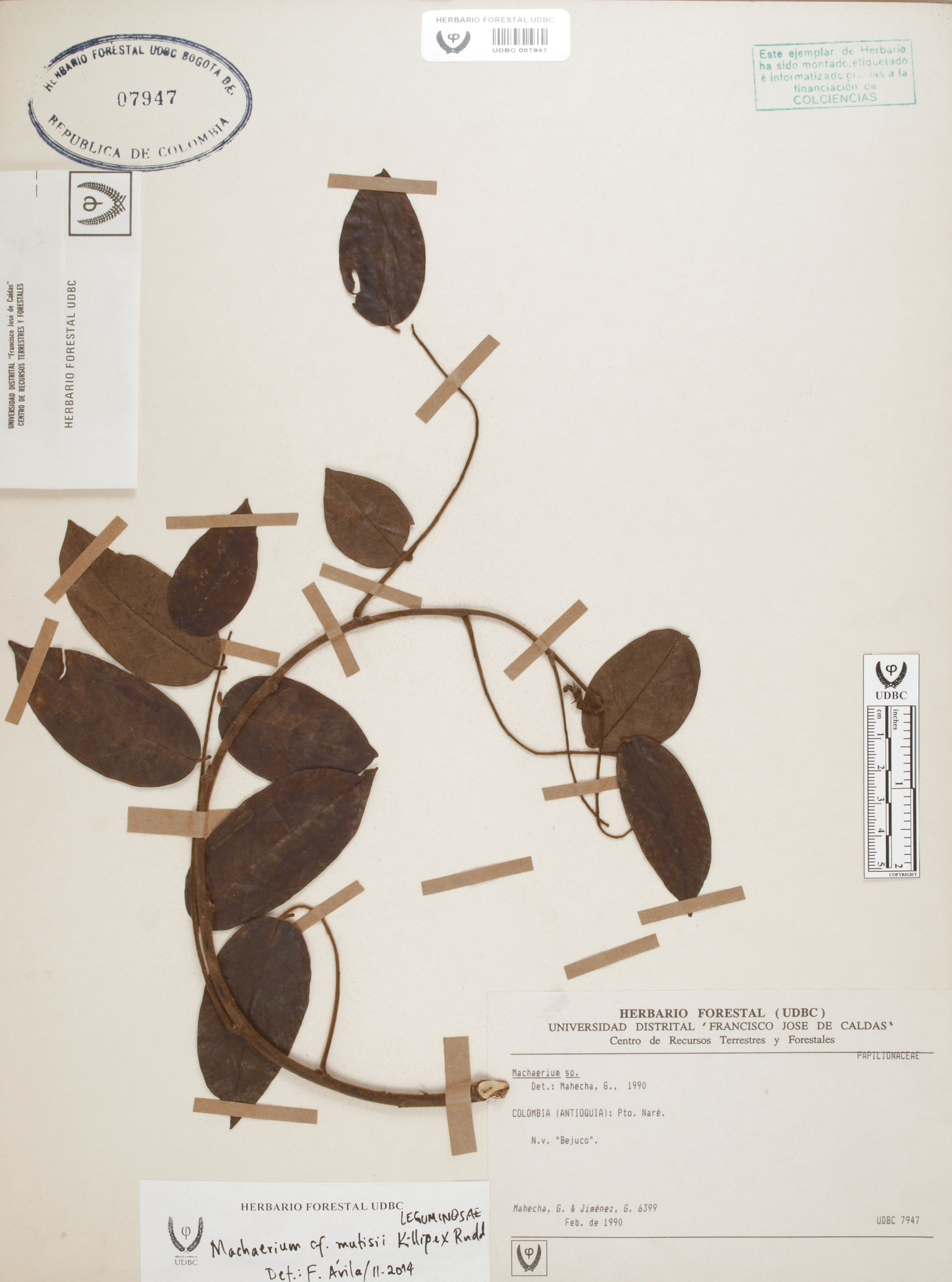 Fotografía del ejemplar Mahecha, G. 6399, determinado como Machaerium mutisii en el año 2014