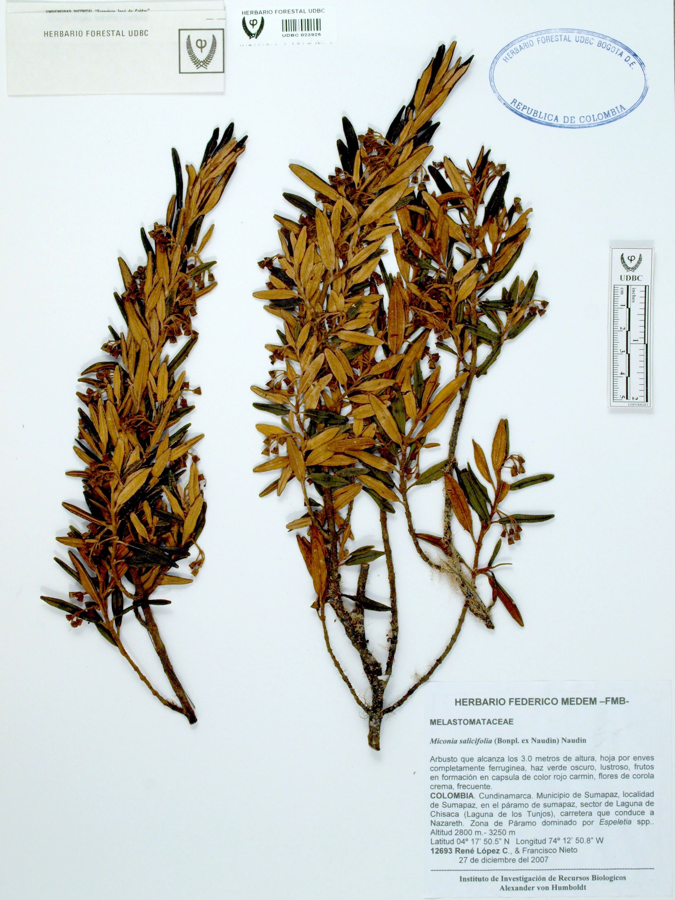 Fotografía del ejemplar López, R. 12693, determinado como Miconia salicifolia
