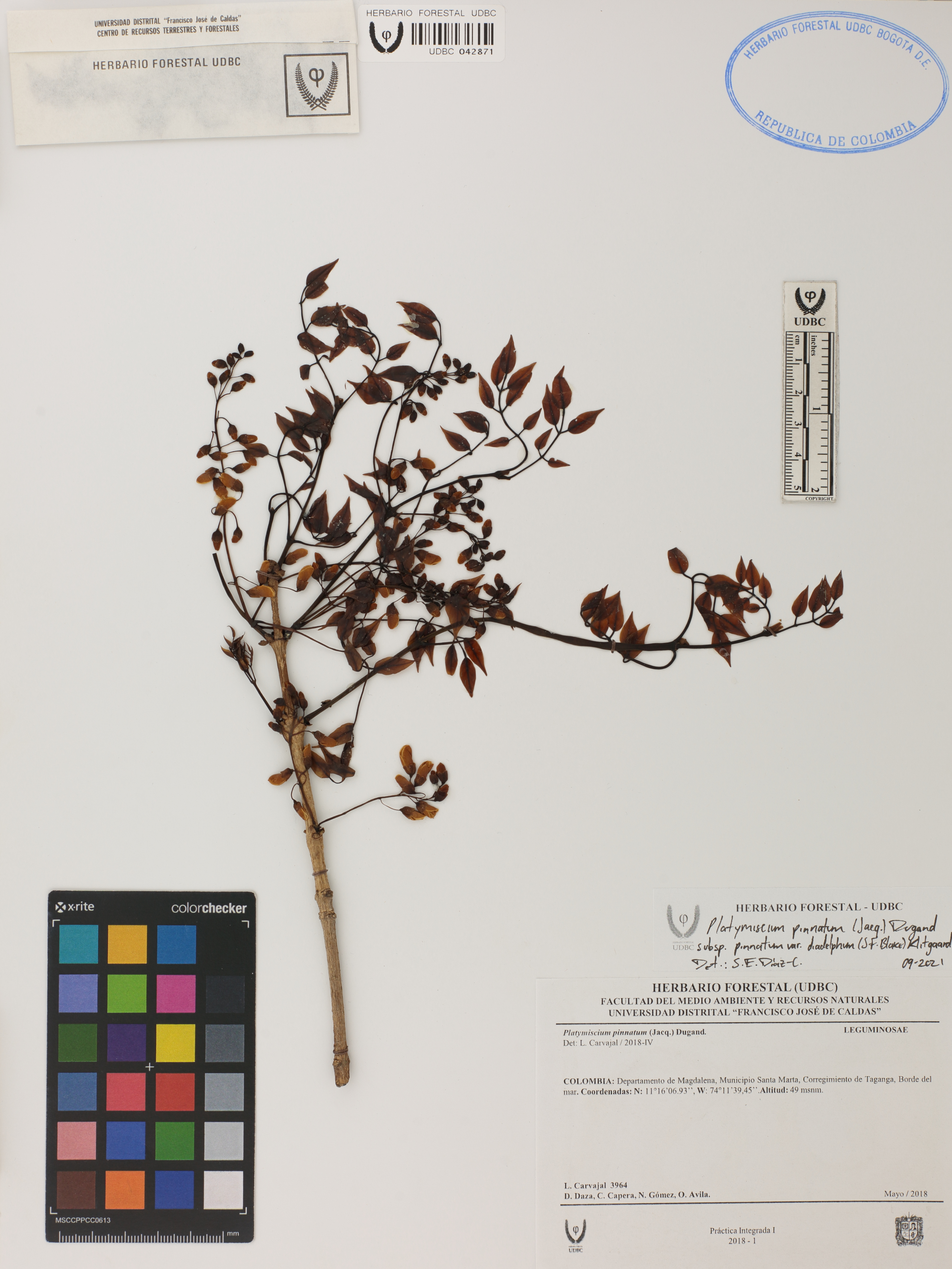 Fotografía del ejemplar Carvajal, L. 3964, determinado como Platymiscium pinnatum subsp. pinnatum var. diadelphum en el año 2021